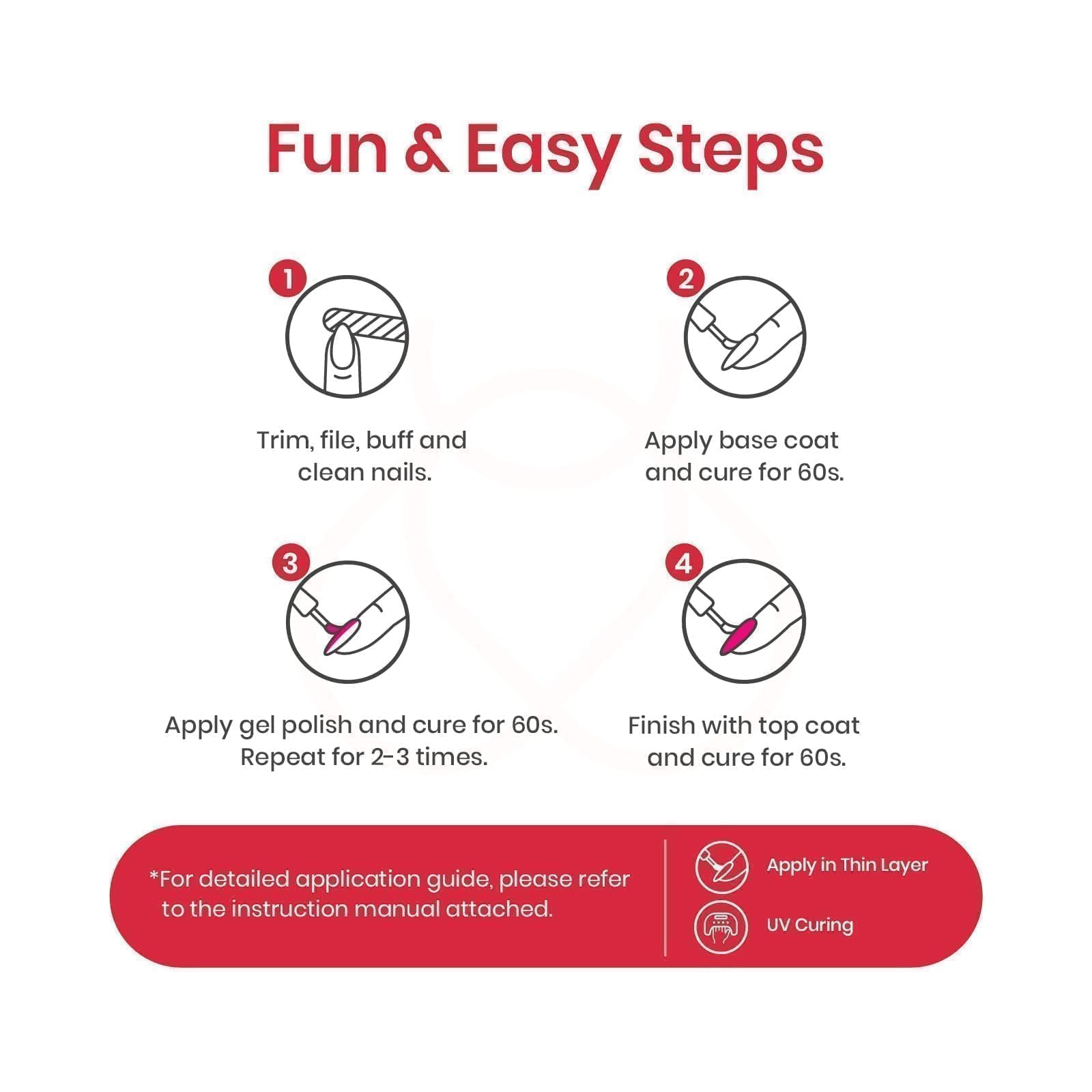 - Soak-off Uv Gel Nail Polish: 36 colors of gel nails polish in blue, orange, white, green, blush-pink, red, brown, purple and glitter gel polish colors need to be cured under a nail lamp. Base and Top coat are required. Average LED curing time is 60-120 secs