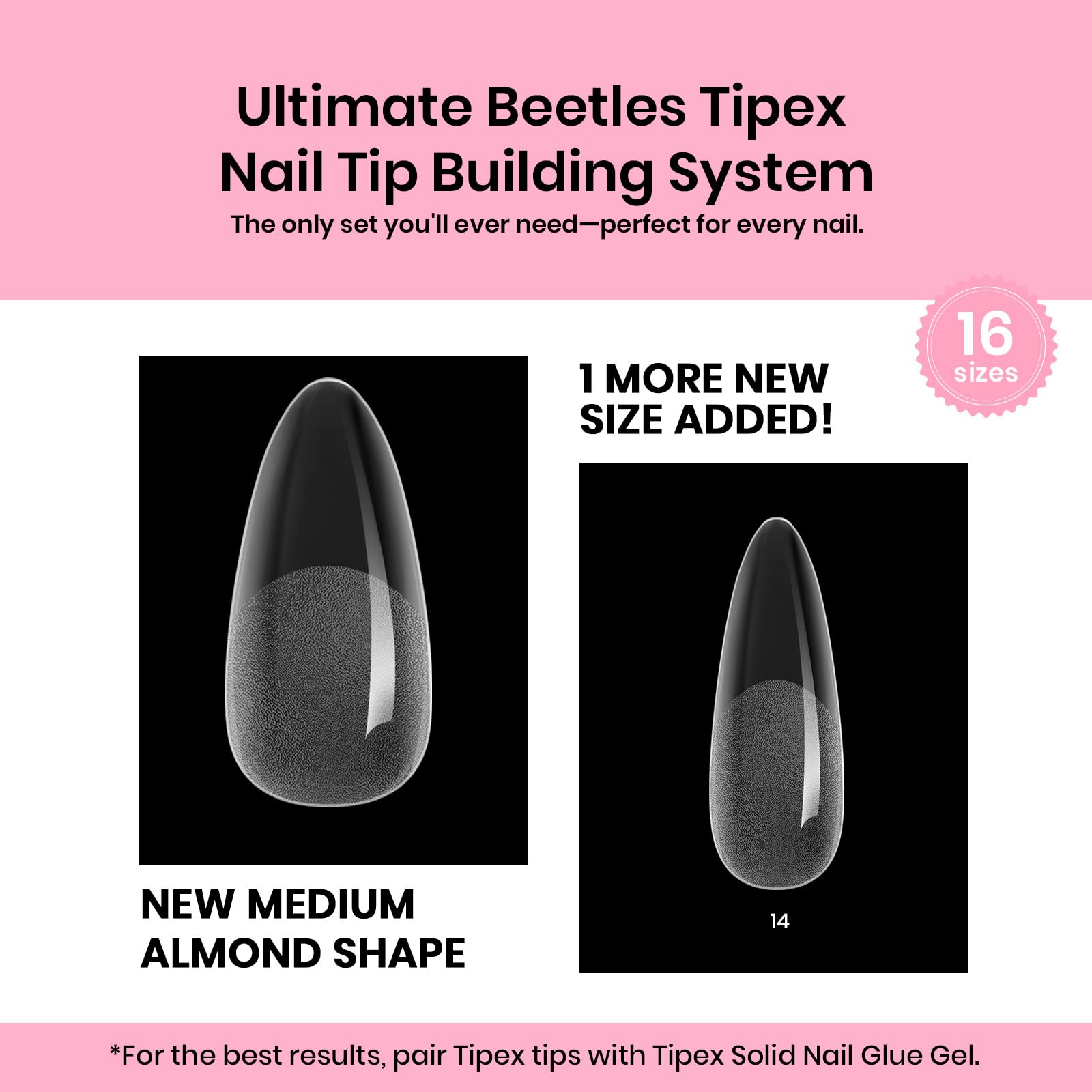 - 【Tipex Instant Apex Nail Tips Kit】: Beetles tipex kit gel nail extension kit includes pre-building acrylic nail tips medium almond shape 224 pieces, hands free solid UV nail glue gel 20g, mini UV nail lamp. Unlock deeper nail art appeal!