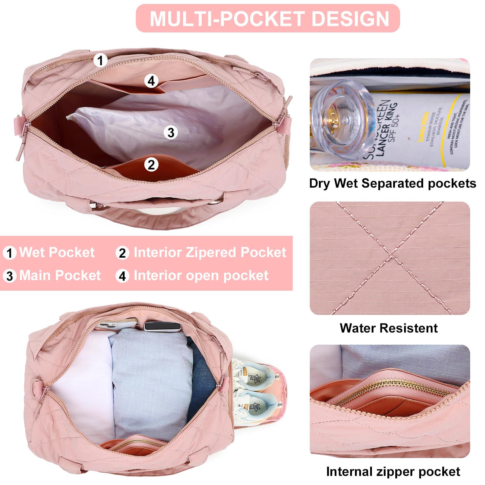- Adjustable and detachable shoulder straps, metal hooks and plastic shoulder straps ensure a fit and non-slip. Padded and wrapped in the handle for more comfort. Very suitable for dance ,gym, swimming, sports, travel, weekend, overnight, yoga, camping, hiking and many outdoor activities