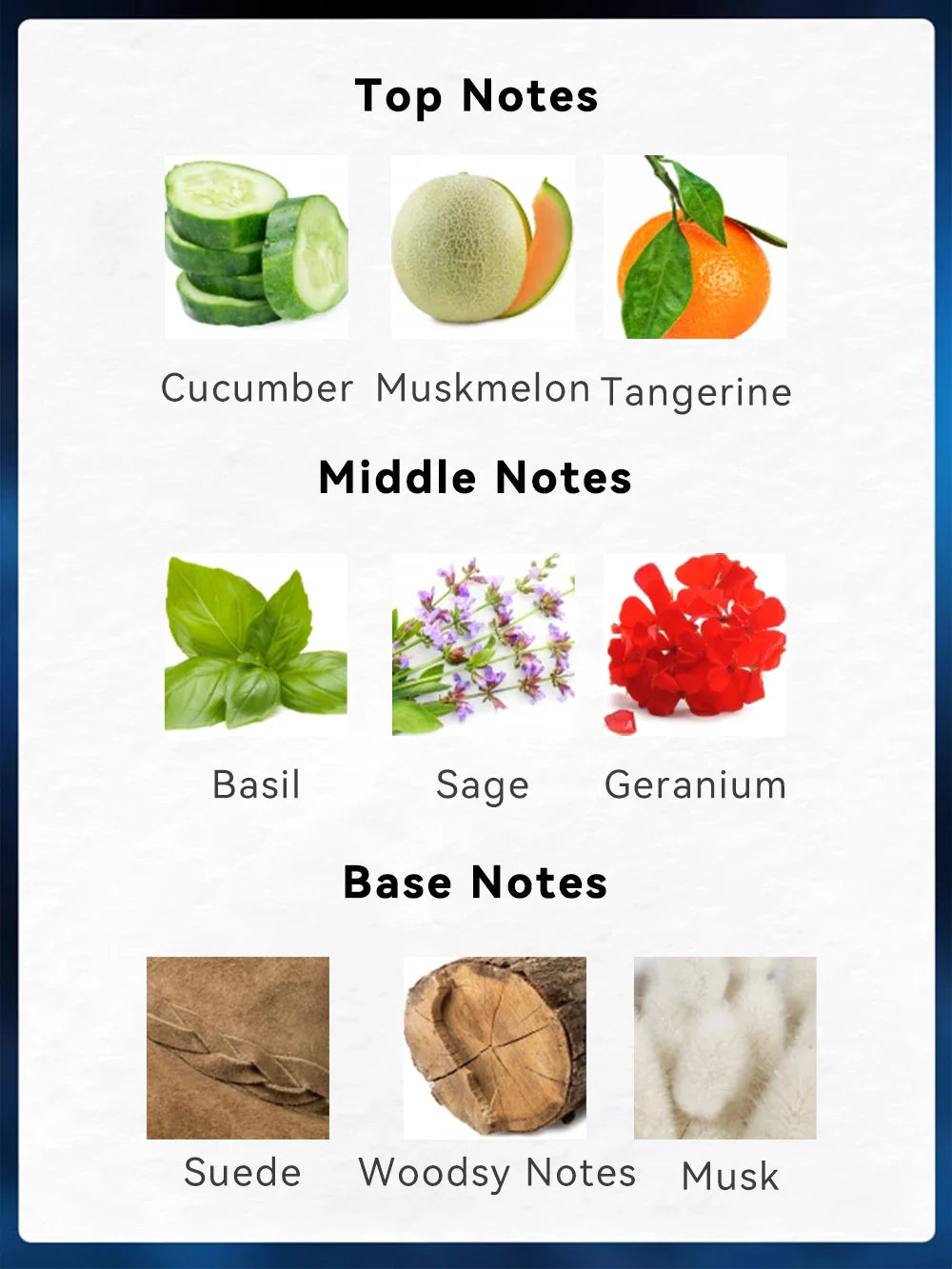 Geranium, and the base notes are suede spices, Woody Notes and Musk, which bring a calm feeling. Every drop is an