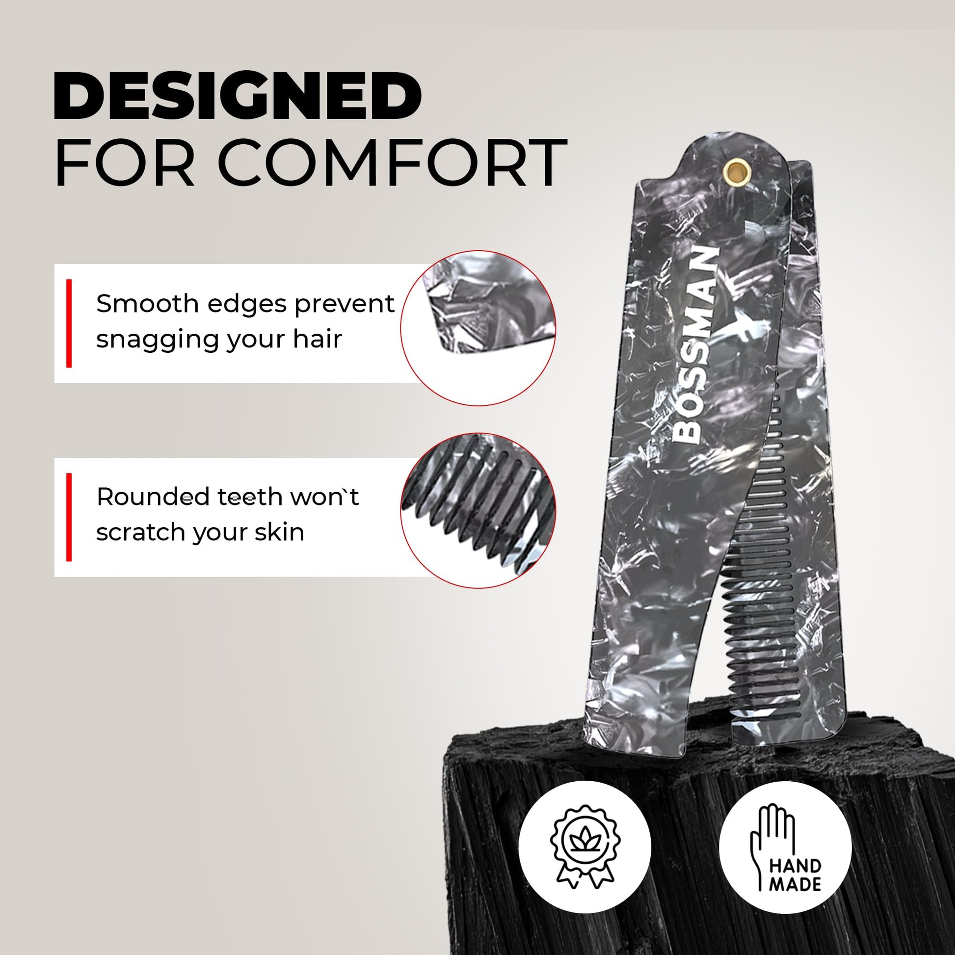 - Graceful Glide: This comb is handcrafted, not molded, and saw cut to ensure there are no jagged edges to snag hair, beard, or mustache. Each tooth is rounded rather and pointed so each stroke won’t scratch your face or scalp and perfectly breezes through any mane.
