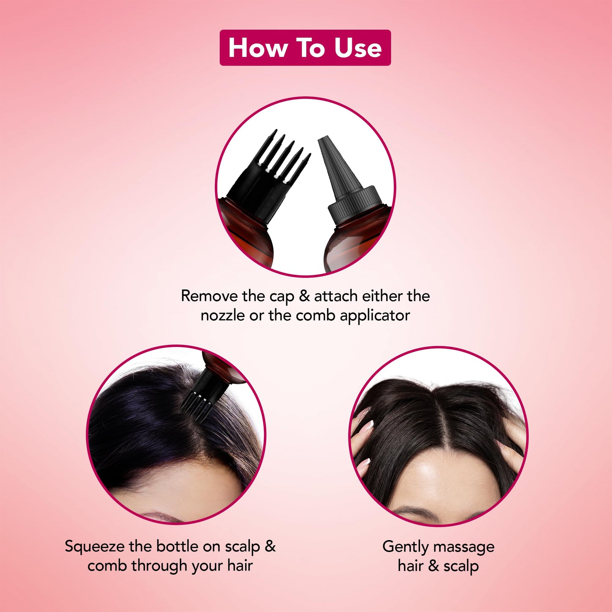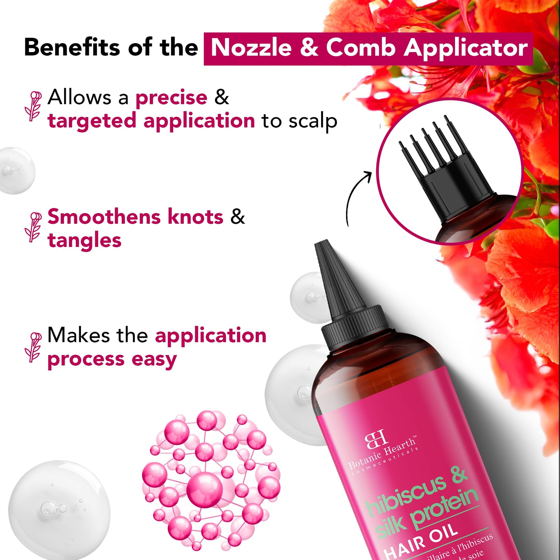- Nozzle & Comb Applicator: The Hibiscus & Silk Protein Hair Oil for hair growth comes with hair oil applicators like nozzle and comb to evenly distribute oil and smoothen knots & frizzes, making the application process effortless