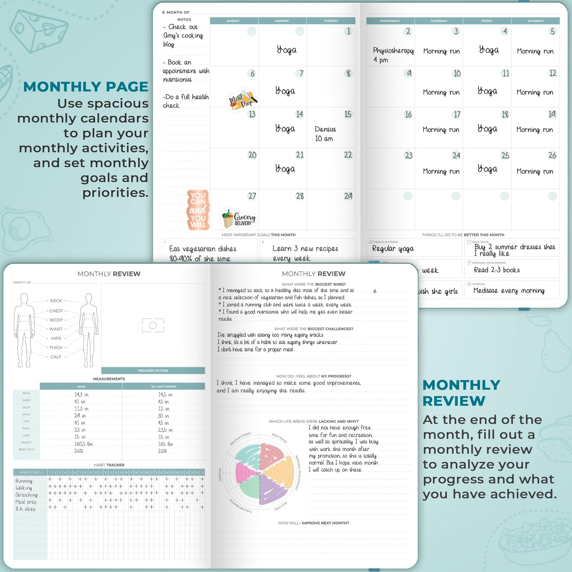 - PLAN, ACHIEVE, REFLECT, REPEAT: This food planner helps you set big goals, break them into monthly milestones and work on them consistently. At the end of each month, you will complete a monthly review to reflect on your progress.