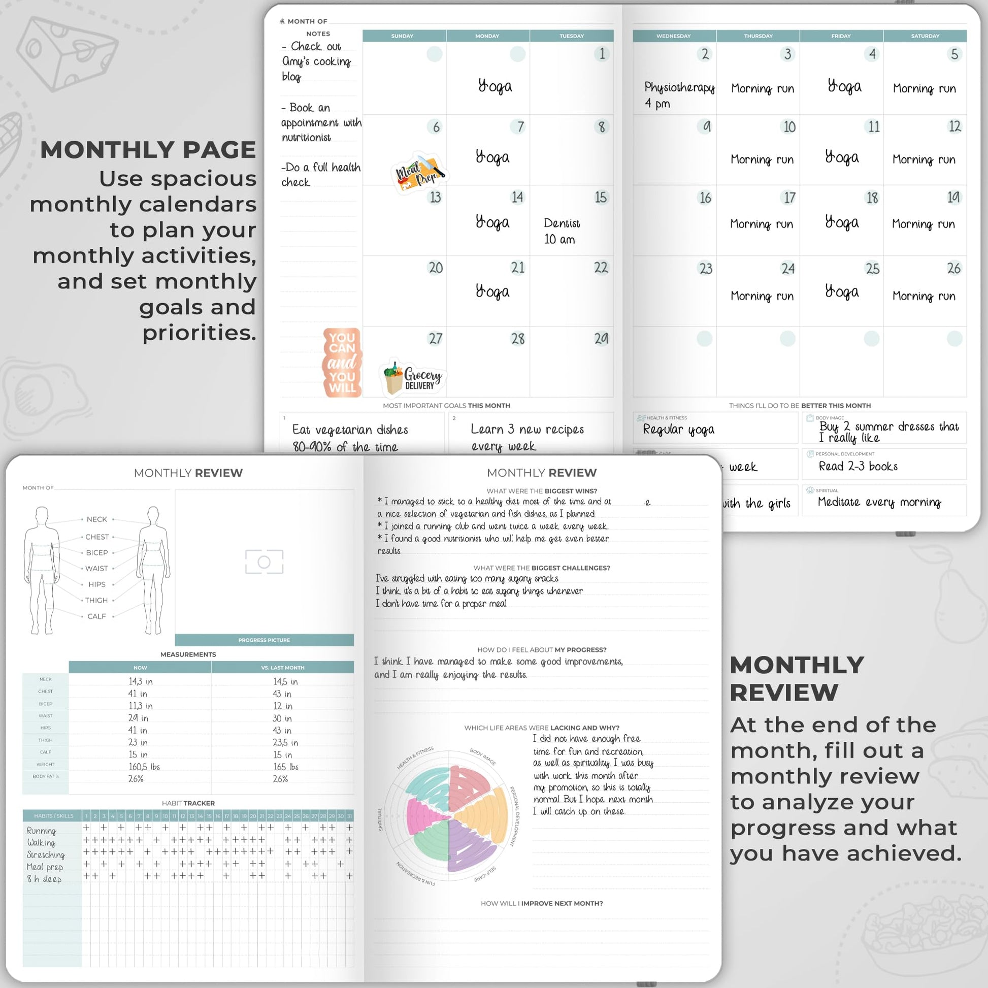 - PLAN, ACHIEVE, REFLECT, REPEAT: This food planner helps you set big goals, break them into monthly milestones and work on them consistently. At the end of each month, you will complete a monthly review to reflect on your progress.