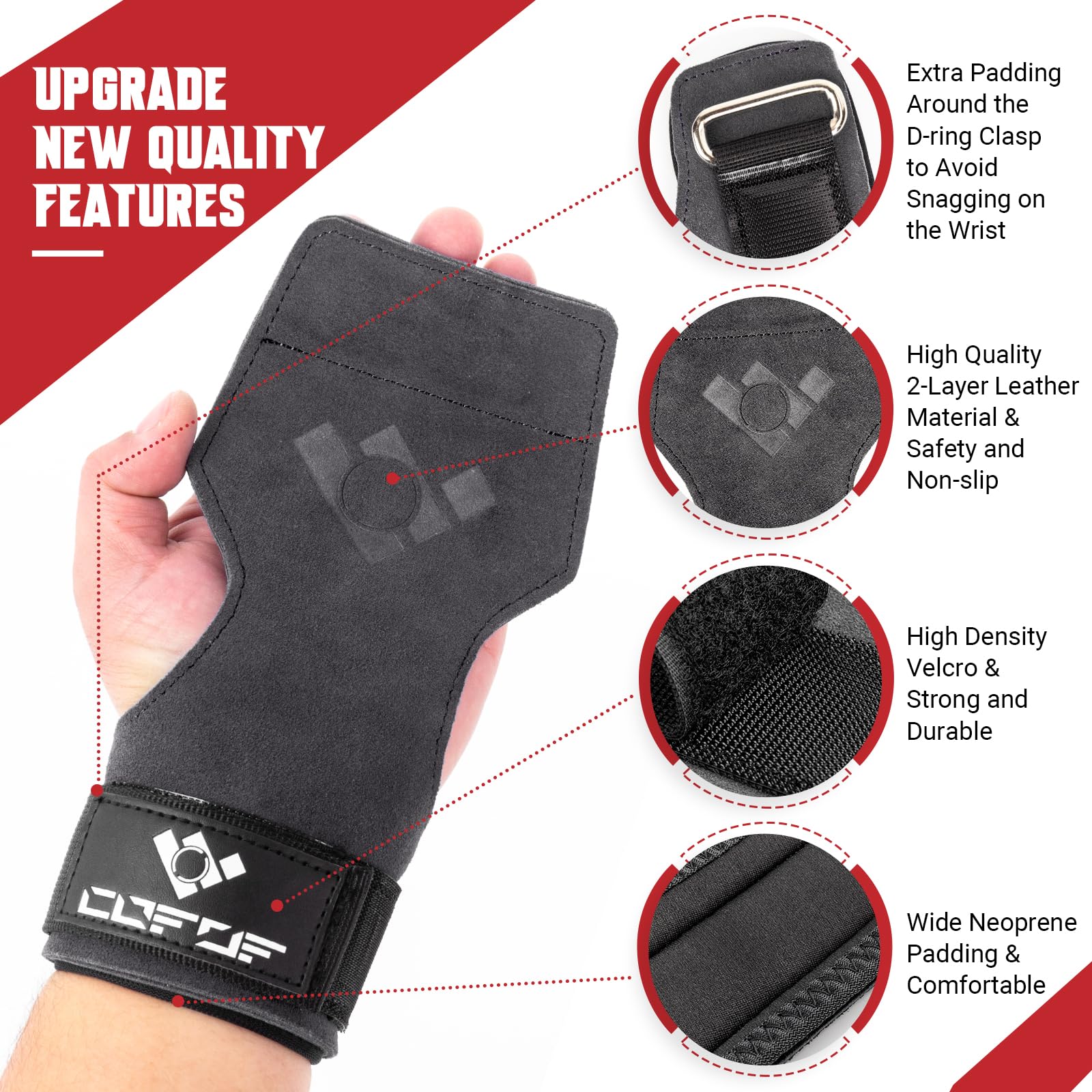 - Upgraded Weightlifting Wrist Strap: Our lifting wrist straps are made of double layers soft leather which is high quality and ergonomically designed to fit your hands and provide better grip. Adding extra padding around the D-shaped metal ring clasp keep your wrist from being squeezed and feel painful. Weightlifting strap with high-density hook and loop can be easily worn on the wrist, and take off and put on freely by yourself. Widened neoprene pad makes you feel comfortable.