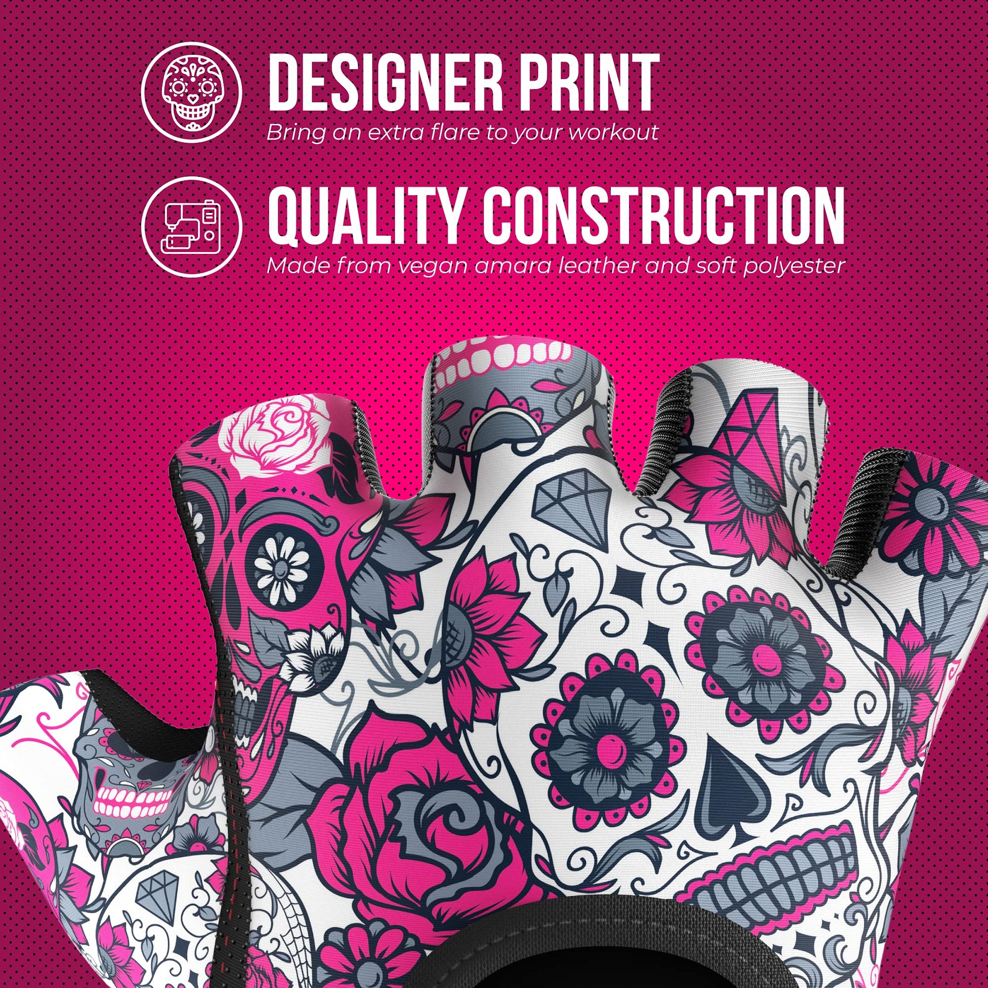 - DESIGNER PRINT - The sugar skull print design on these fitness gloves brings an extra flare to your style. Classic and modern colors of our workout gloves for women allow you to mix and match with different outfits. Our weight lifting gloves for women really add a dazzle to your gym attire. Now, you can look great and stylish while staying fit!