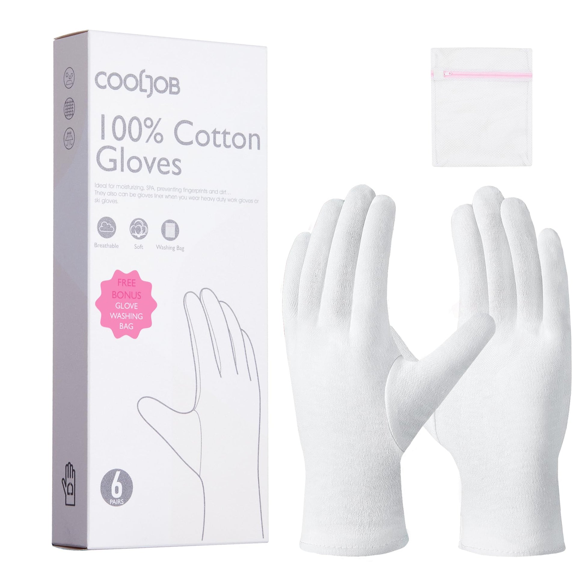 - ULTIMATE MOISTURIZING RELIEF: COOLJOB's 100% premium cotton white gloves heal dry, cracked hands, providing relief for eczema and psoriasis, prevent scratching, and keep the lotion off sheets during sleep. Enhances the impact of hand lotions and creams for softer and smoother skin, ideal for frequent hand washers.