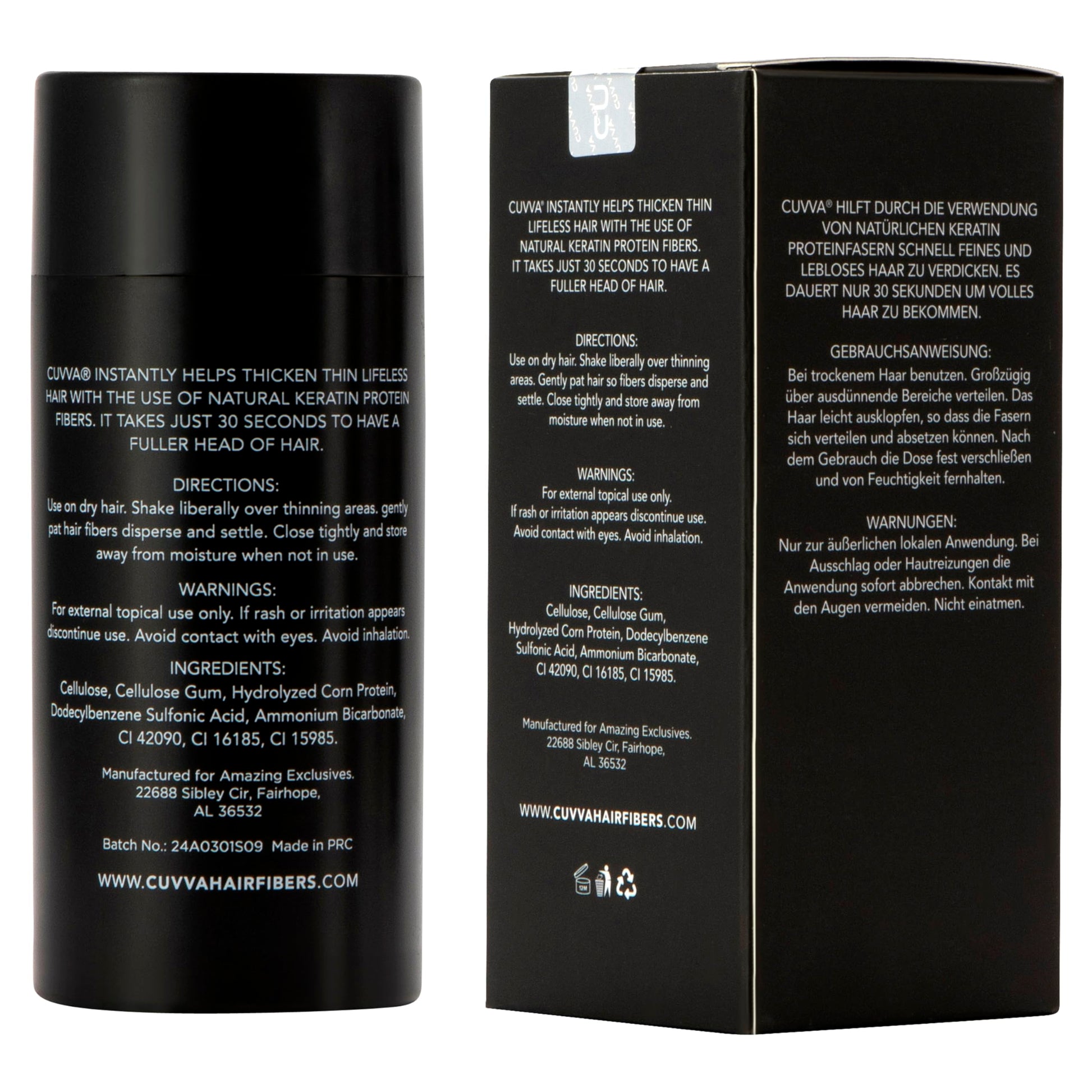 - Cuvva Keratin Fibers: Made of the best organic protein, interlaces with natural hair perfectly.