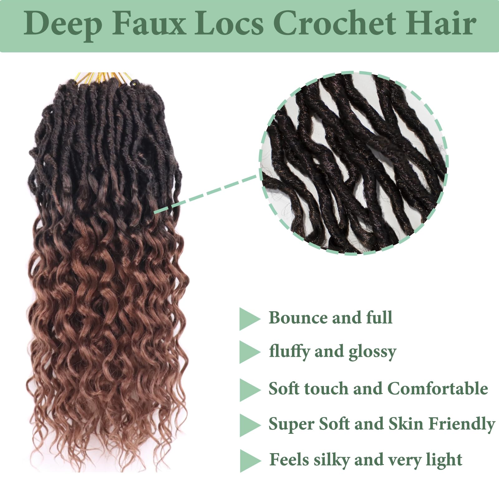 - New Trendy and Edgy Look:Soft locs with curly ends,Deep faux locs with curly ends,Goddess locs crochet hair,Faux locs crochet hair for black women,Crochet braids for black women,Deep Wave crochet braids. Long pretty crochet locs is easy to install and style in multiple ways
