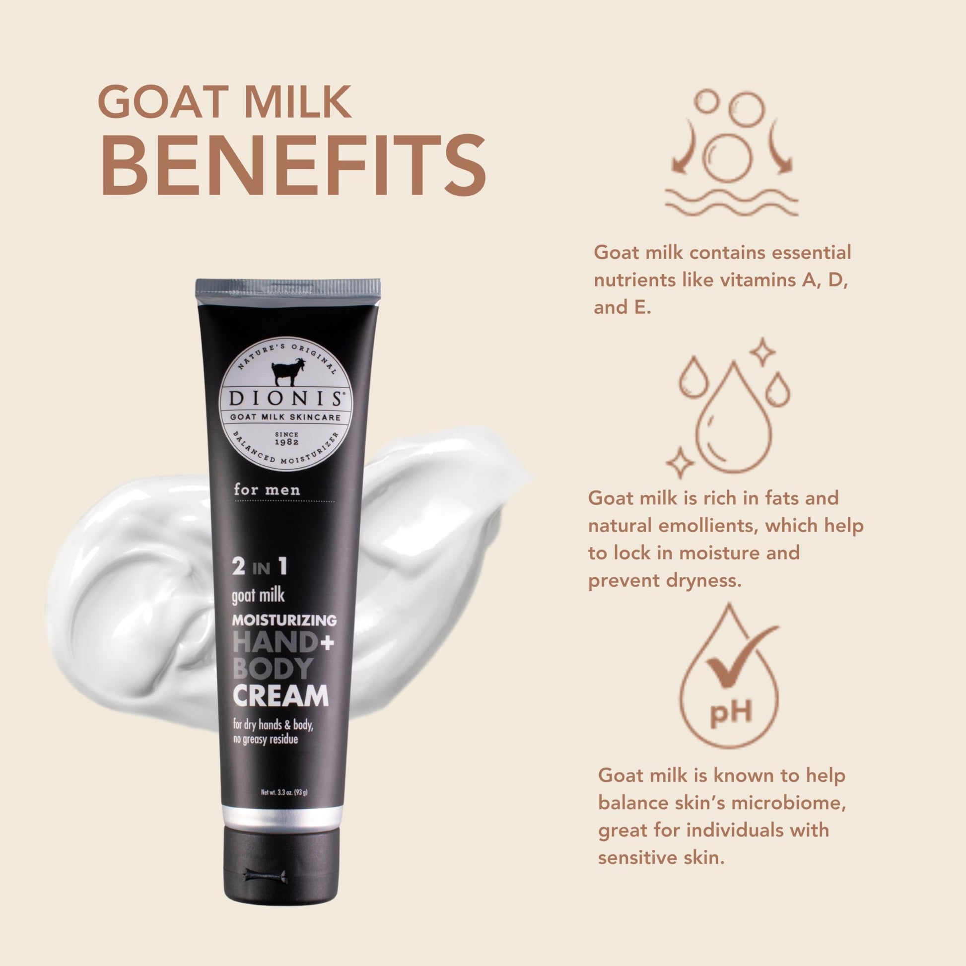 - Experience The Goat Milk Benefits - Share the joy of healthy skin with Dionis Hand & Body Cream. Formulated for men, this goat milk lotion makes a great gift option this Father's Day. Add to any gift box, gift bag or gift basket and keep Dad's hands feeling smooth and hydrated wherever he goes.