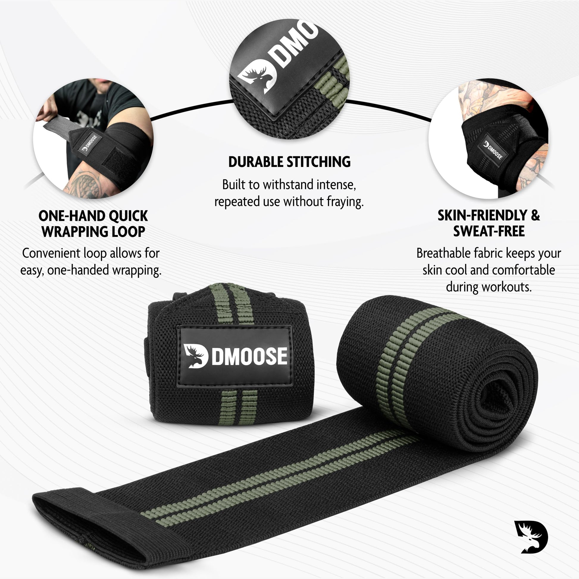 - HELP YOU ACHIEVE MAXIMUM STRENGTH: DMoose weight lifting elbow wraps for men are a great way to increase your strength and stability while exercising. They provide maximum support, keep you away from inflamed joints which can cause soreness.