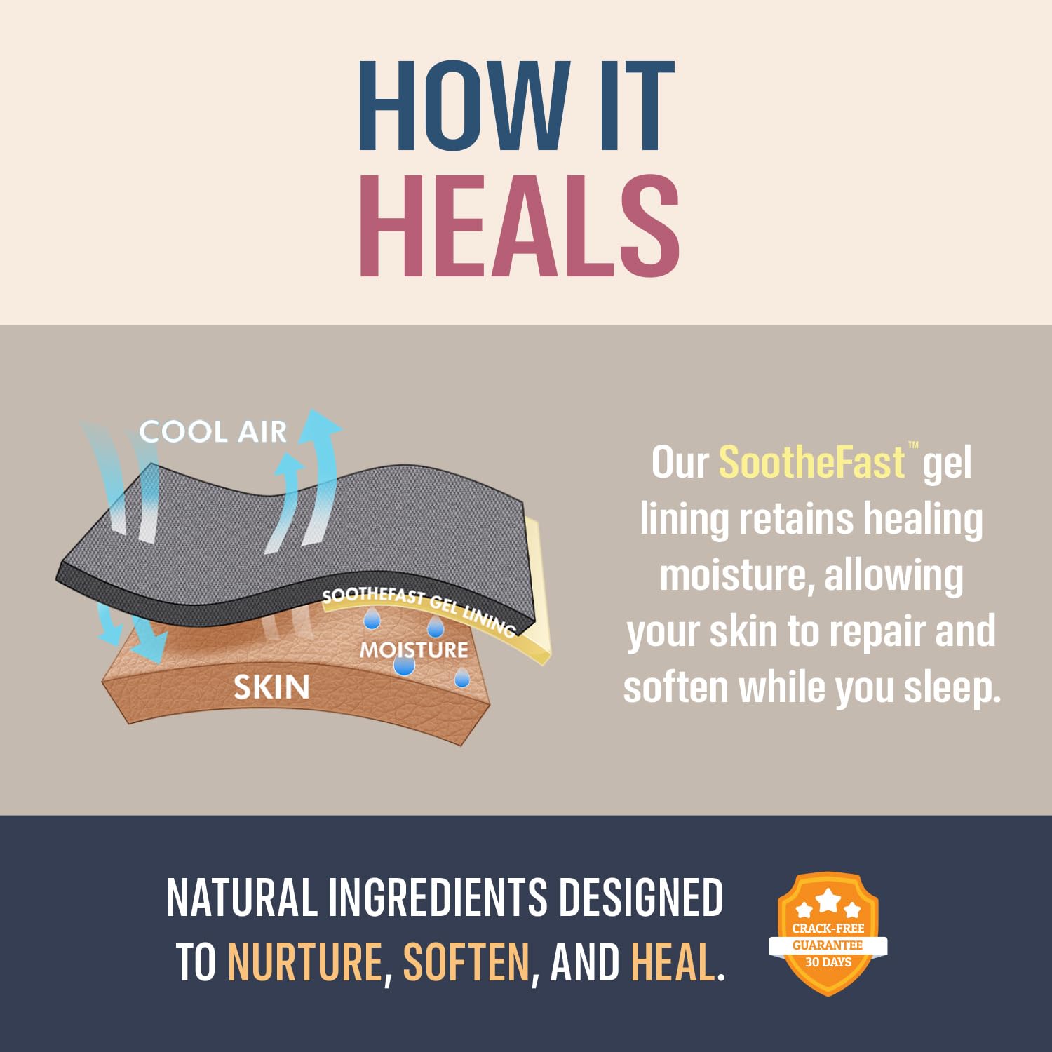 - Gel Lining Locks in Healing Moisture: Want to know our secret? The gel lining in our heel socks helps to trap moisture, allowing hydration and repair while you sleep. For more damaged heels or faster results, follow our recommended dream foot care routine: soak your feet, lather on lotion, and wear your socks all night long for the first 7 days. If you plan to wear the socks during the day, just skip the lotion to avoid slippery heels.