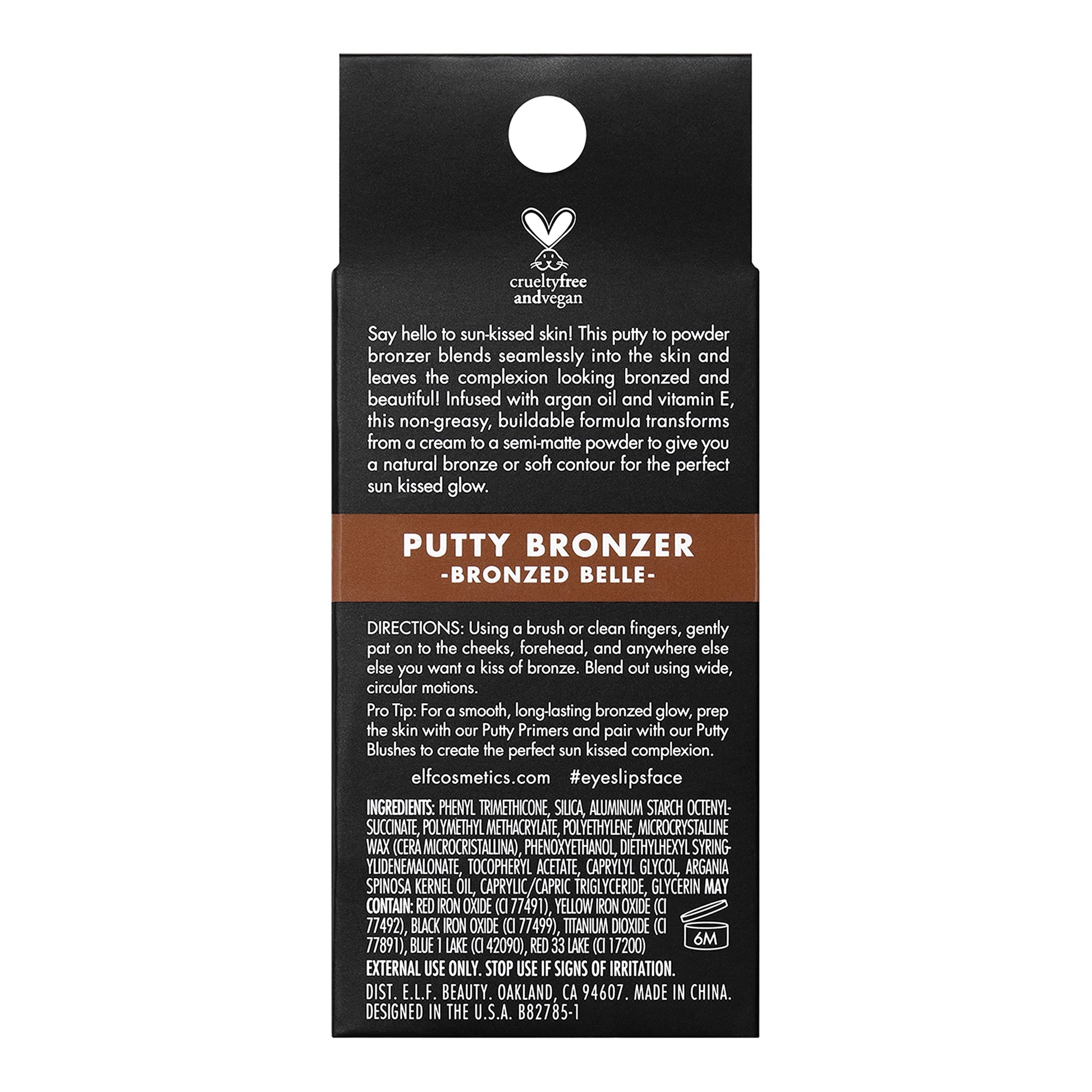 - CREAM-TO-POWDER FINISH: Bask in that sun-kissed, back-from-vacation glow all year round with e.l.f. Putty Bronzer. This unique creamy putty-to-powder bronzer delivers highly pigmented, buildable color, and effortlessly blends and blurs into skin, delivering a natural bronzing effect with a smooth, semi-matte finish.