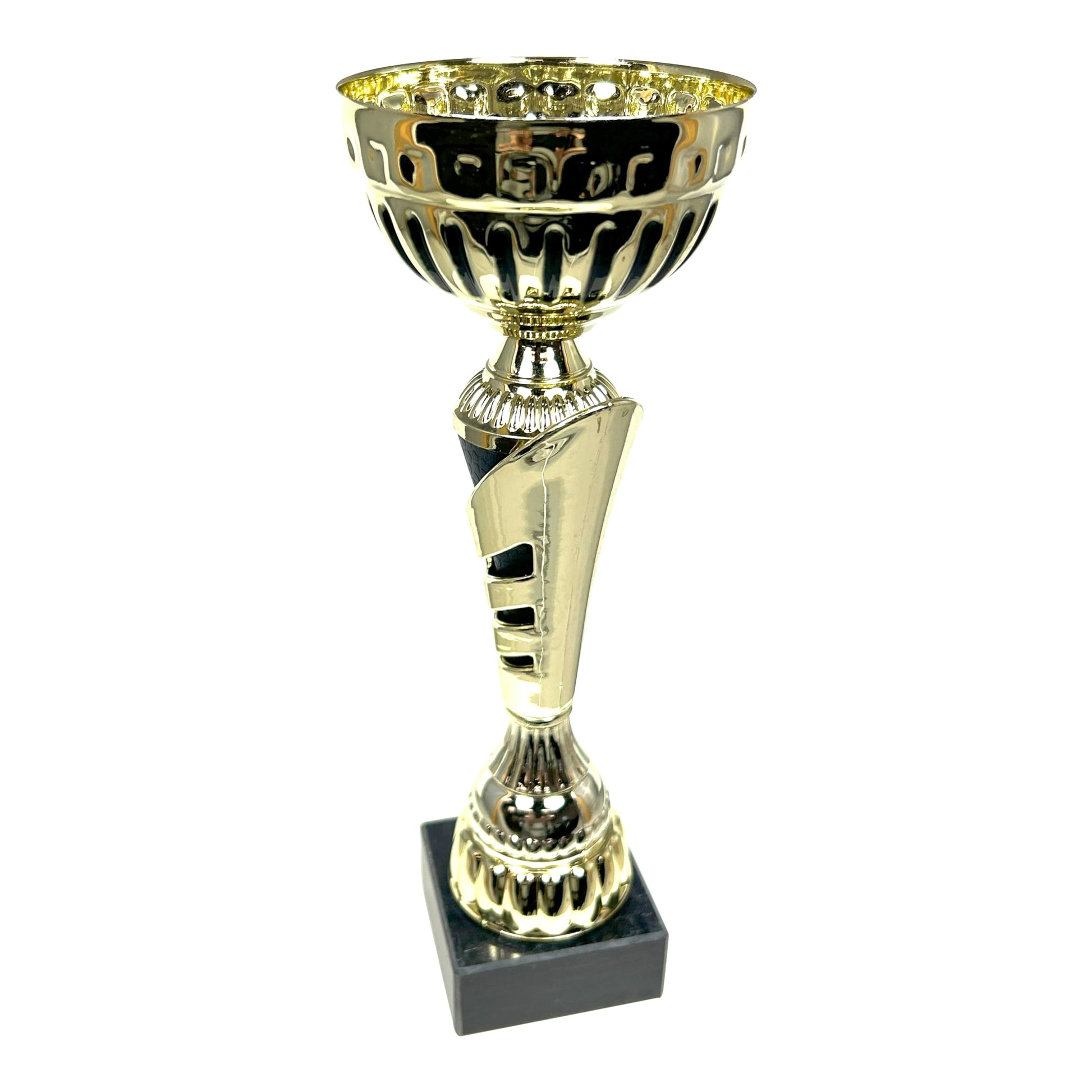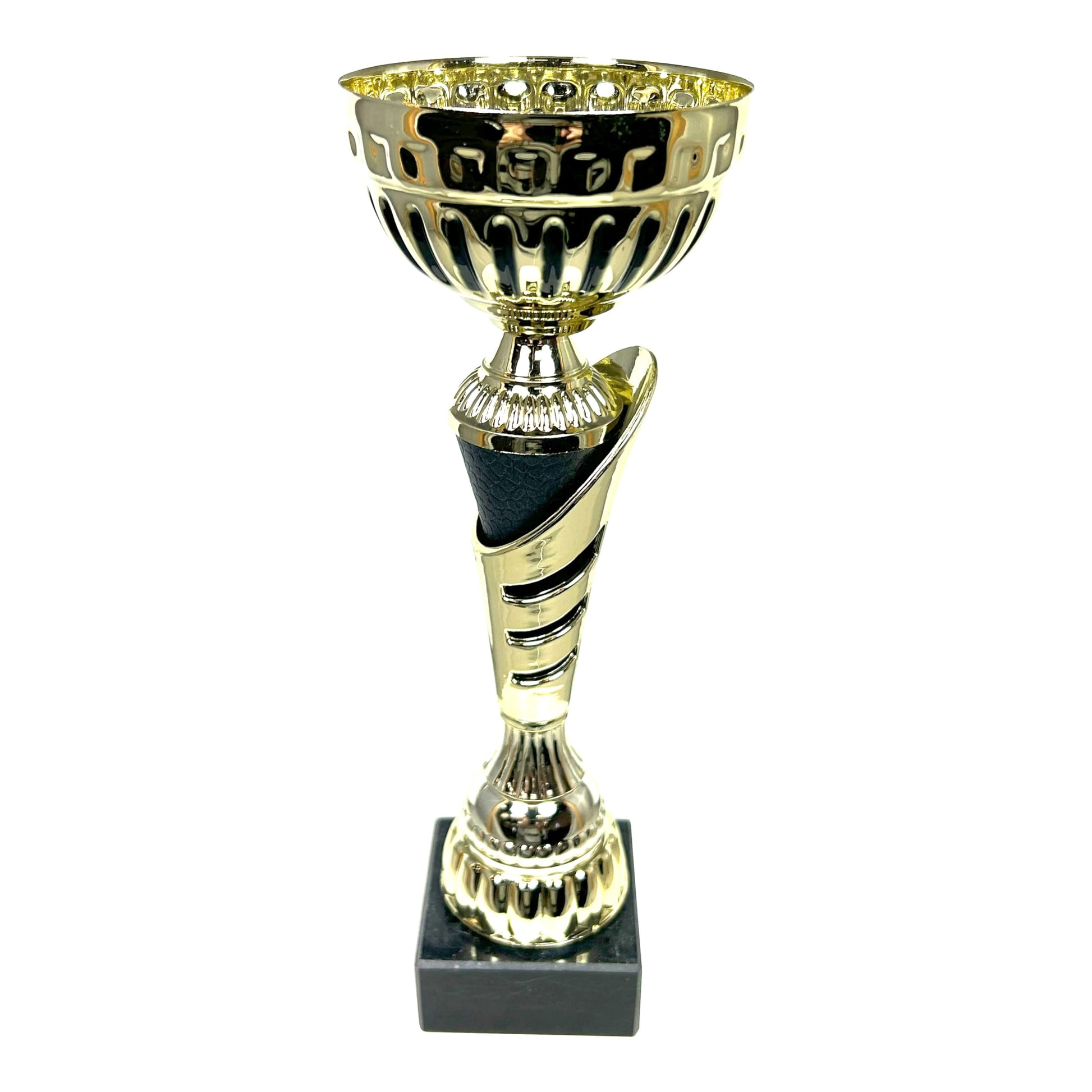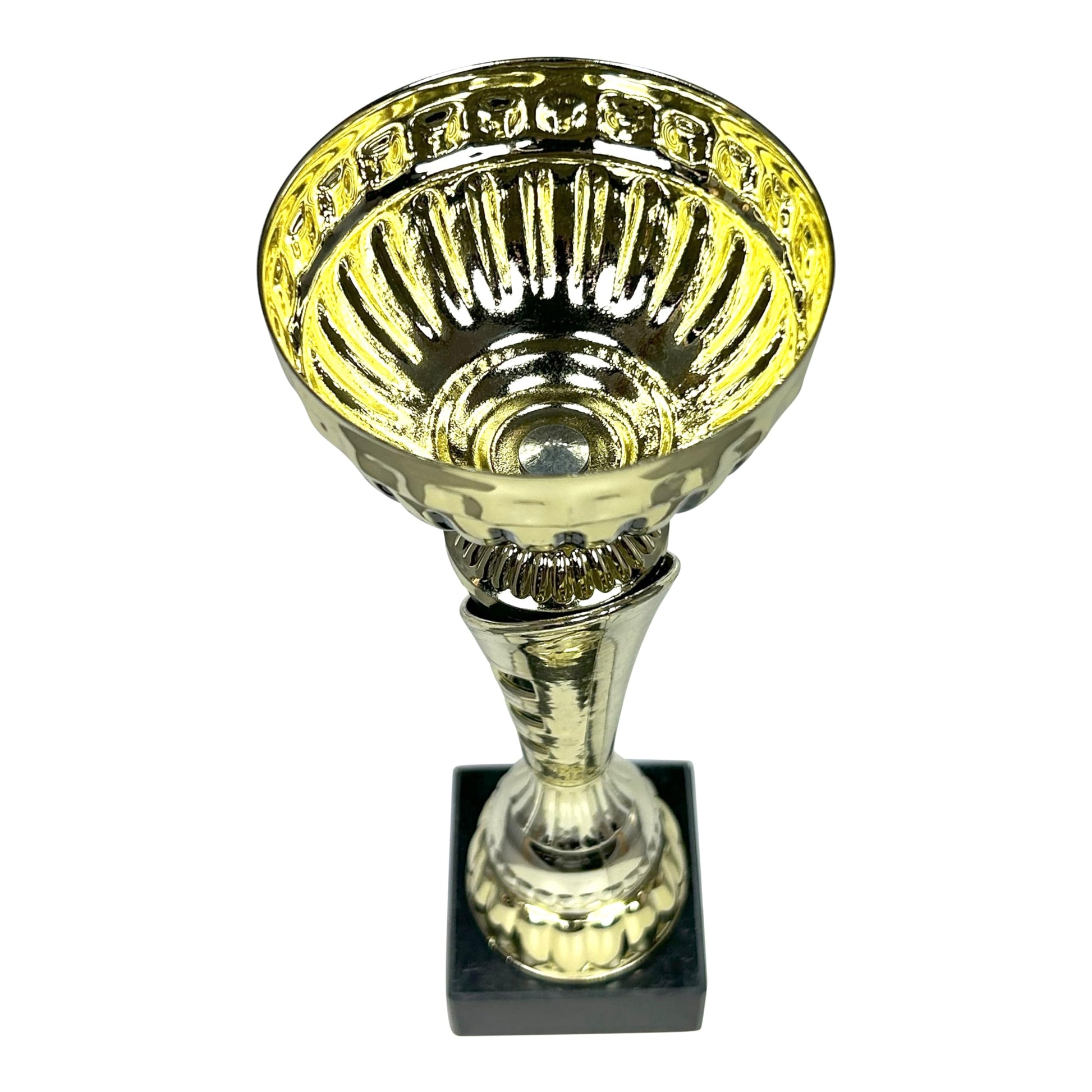 Details: 10.25 Inch Tall - 3.5 Inch Wide at the top of Trophy Cup, Cup made of Metal and stem - riser made of rigid Plastic. Genuine Black Marble Base - Bright Gold and Matt Black detailed Colors Champion Tournament Winner Trophy Cup.