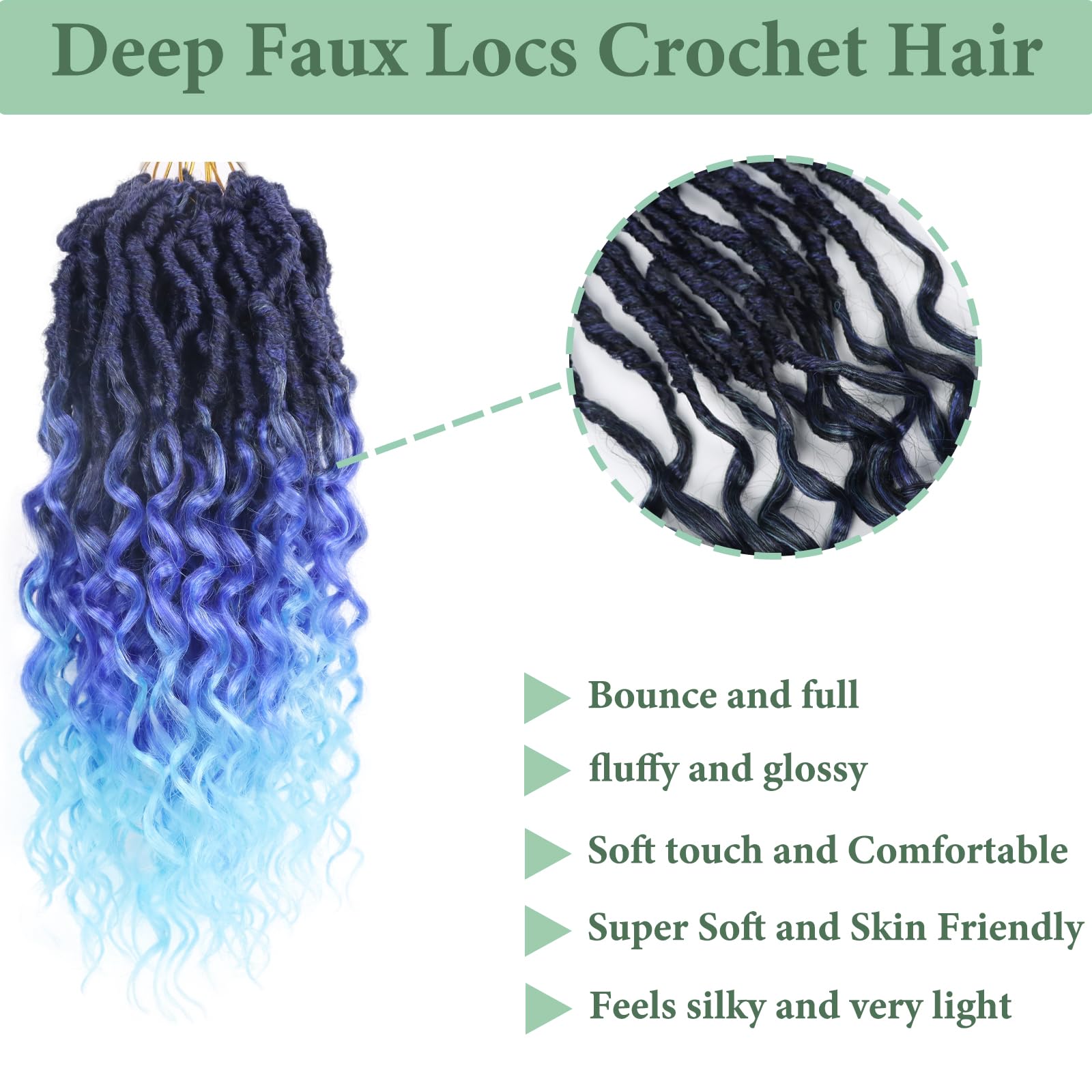 - Faux Locs Material:Deep Faux Locs Crochet Hair is made with high-quality, synthetic hair fibers.Natural looking with blends well,softness,lightweight and comfortable to wear.The natural-looking texture mimics real hair,ensuring a seamless blend with your natural hair,Making it the perfect choice for any occasion
