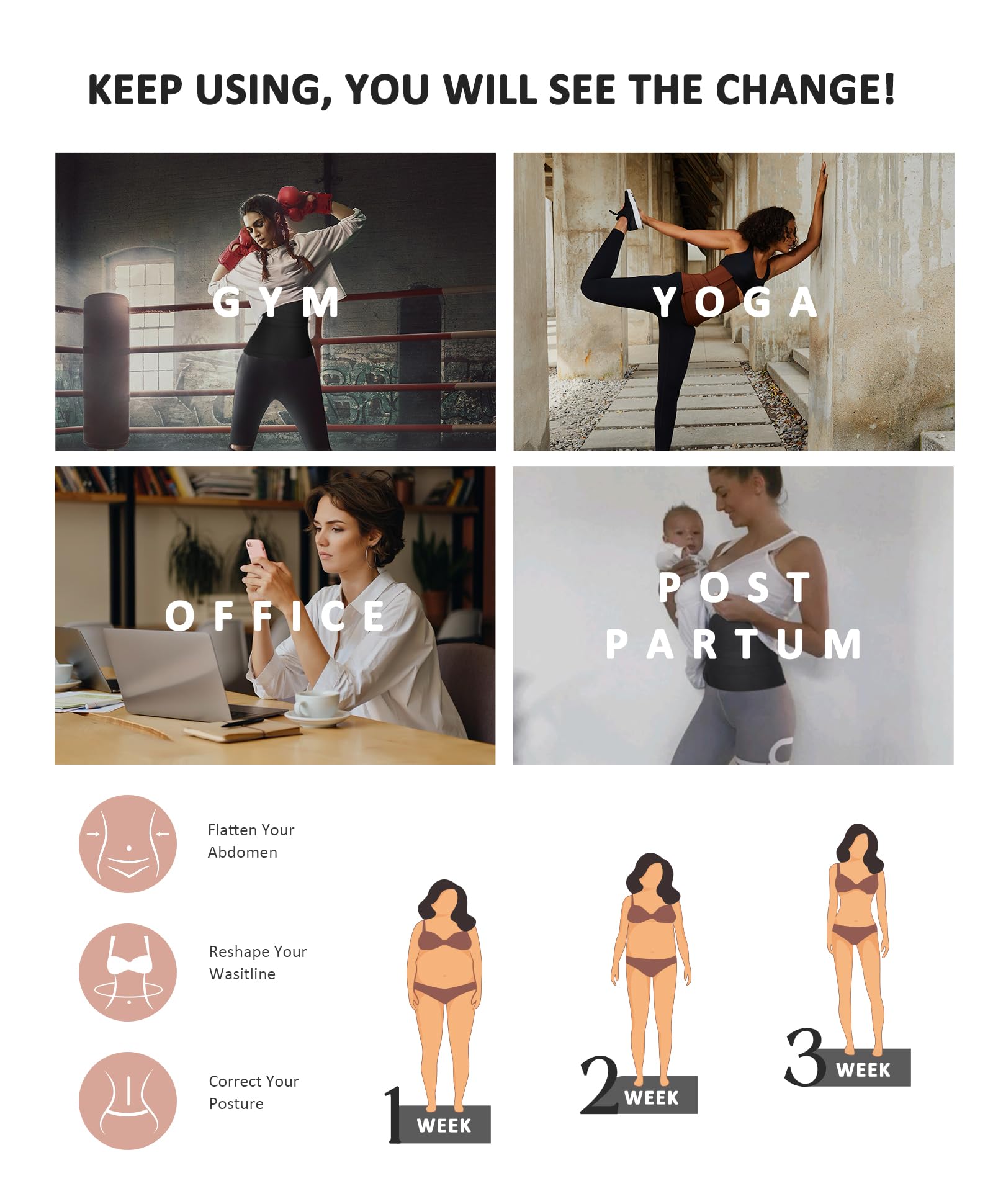 - Tips: Wear it consistently for 6 to 7 weeks, and you can expect to reduce your waistline by 6-8cm. Combine with exercise and a balanced diet for optimal results. Ideal for everyday wear, whether during work, running, workouts, postpartum recovery, or other fitness activities.