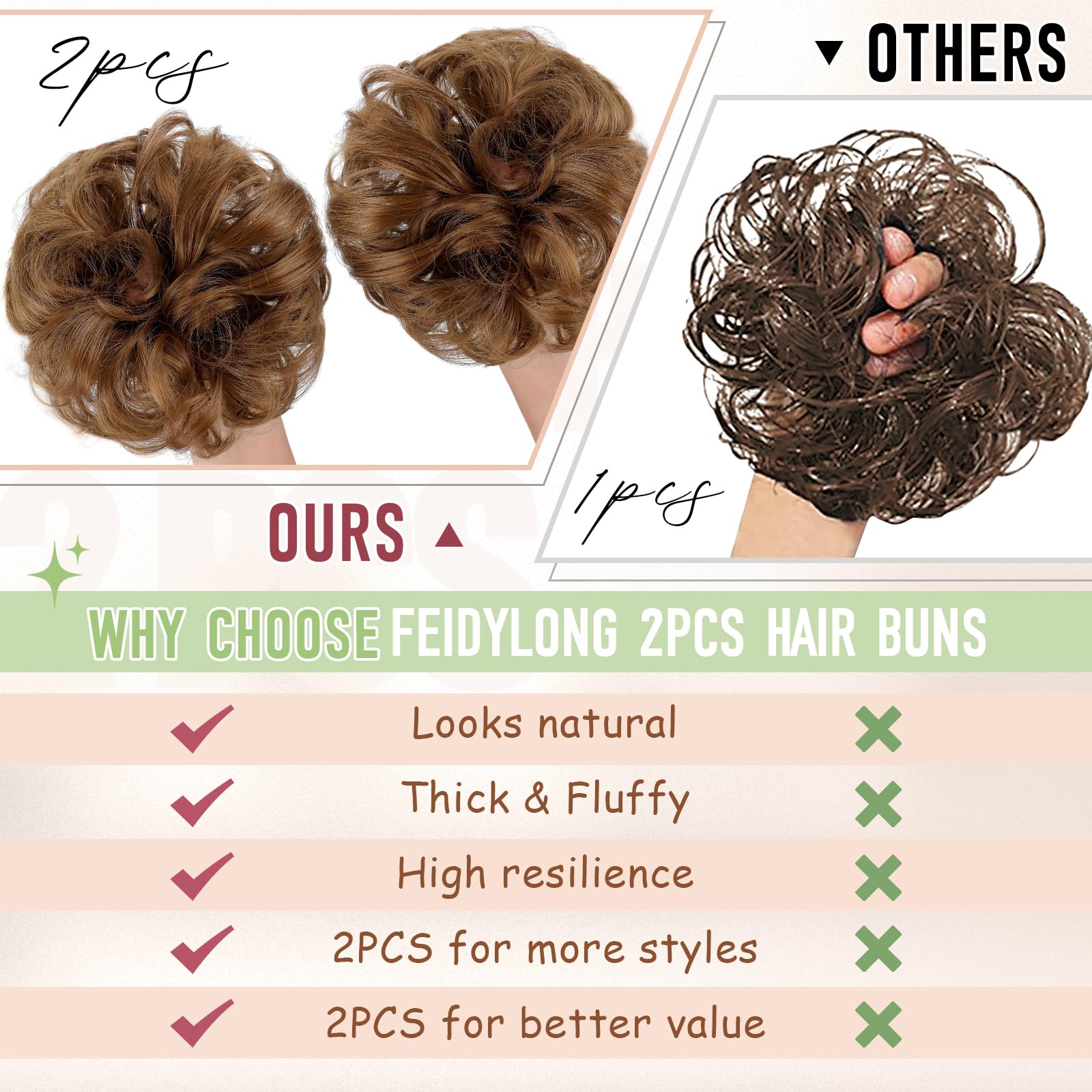 FeidyLong 2 PCS Messy Bun Hair Piece Wavy Curly Scrunchies Synthetic Chignon Ponytail Hair Extensions Thick Updo Hairpieces for Women Girls(Light Auburn)