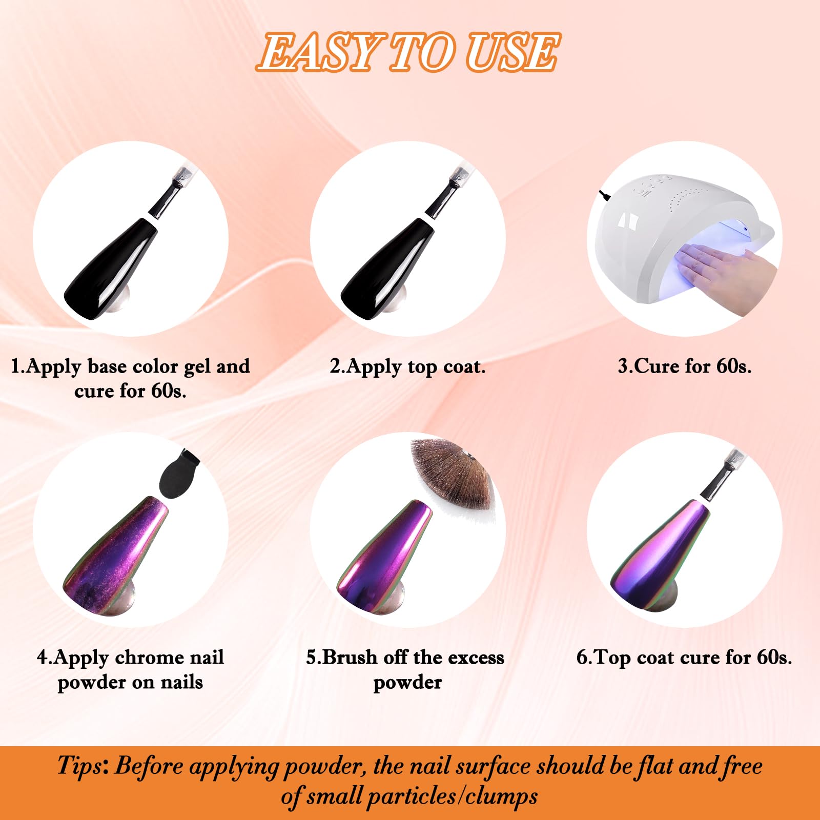 - Wide Application: Works with gel polish, no-wipe topcoat. Compatible with UV/LED lamp curing. These pearl chrome nail powder can be applied on UV gel nails, acrylic nails, natural nails, or false nail tips