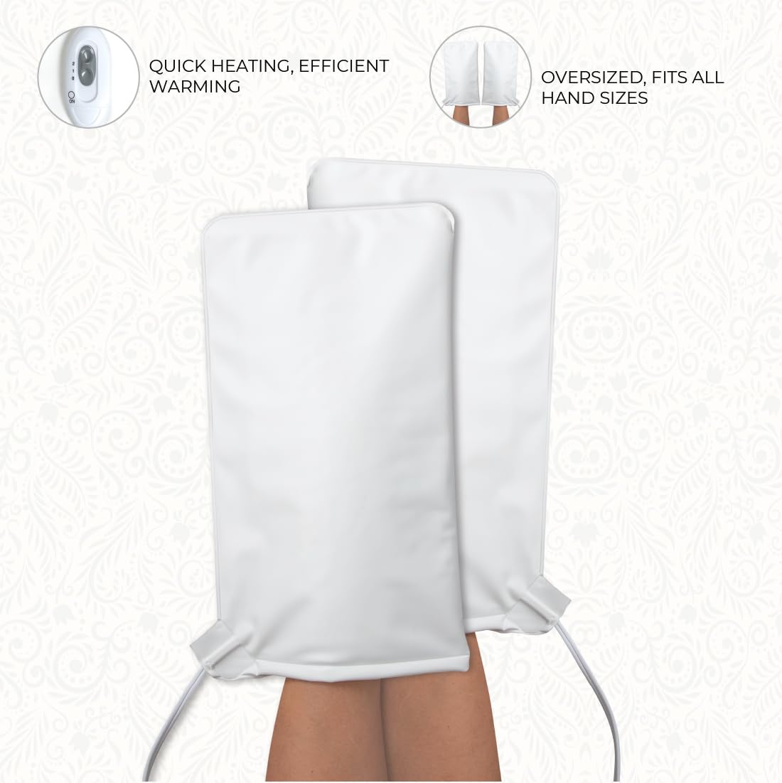 - Oversized Hand Warmers: The hand warming mitts are oversized to fit all hands and measure 13β x 7β. The cord between mitts is 12β long, and the outlet cord from mitt to outlet is 6β long.
