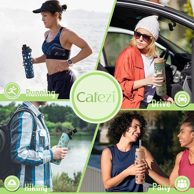 - 【TWO WAYS TO DRINK】Cafezi glass water bottle with sleeve come with two kinds lids ,The one bamboo lid with straw ,It is suitable for all kinds of cold drinks. Whether you're driving or at home or in the office,both are very good choices. The plastic spout lid with handle ,is 100% leak-proof more suitable for carrying around,the best partner for outdoor travel.