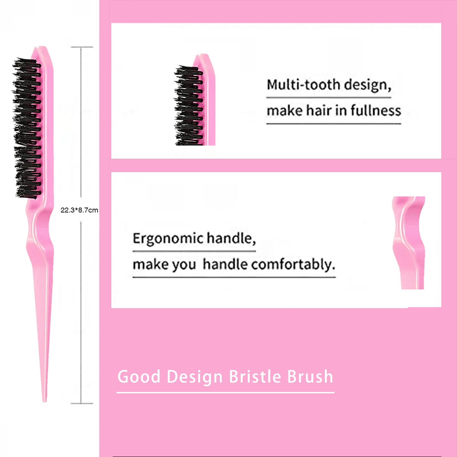 - Hair Comb Set: Our edge brush set is cluding 2pcs edge brush, 2pcs teasing brush, 2 pcs rat tail comb and 6pcs hair clips, all tools is perfect for your hair care.