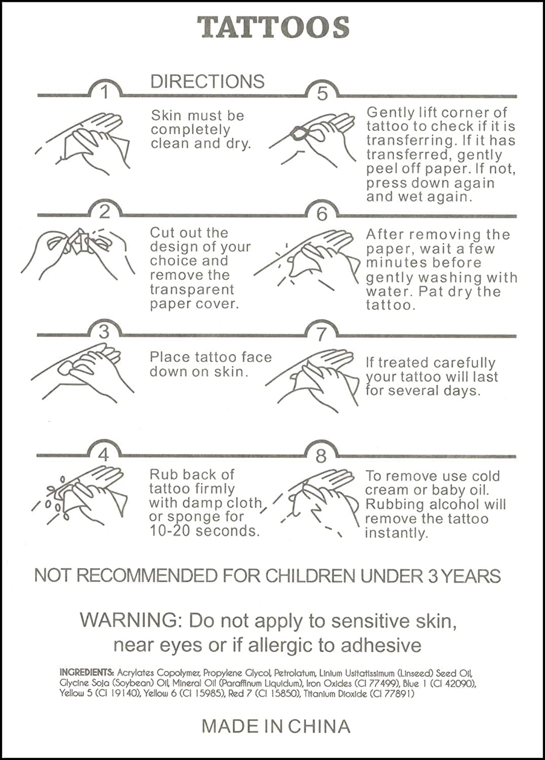 - 【Package】2 sheets of 6'X 8', and 1 sheet of 2.3'X 4' temporary tattoo.