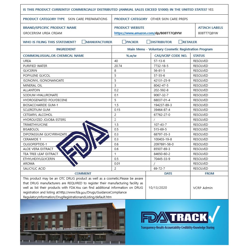 - 【Organic Ingredients】Water, Urea, Glycerin, Propylene Glycol, Isononyl Isononanoate, Mineral oil, Allantoin, Hyaluronic Acid, Hydrogenated Polydecene, Salicylic acid,Biosaccharide Gum-1, Sclerotium Gum, Cetearyl Alcohol, Trimethylglycine, Bisabolol, Dipotassium Glycyrrhizate, Ceramide 1, Oligopeptide-1, Aloe Vera extract, Tea Tree Leaf Extract, Ethylhexylglycerin, Aroma, Hydrolyzed Jojoba Esters