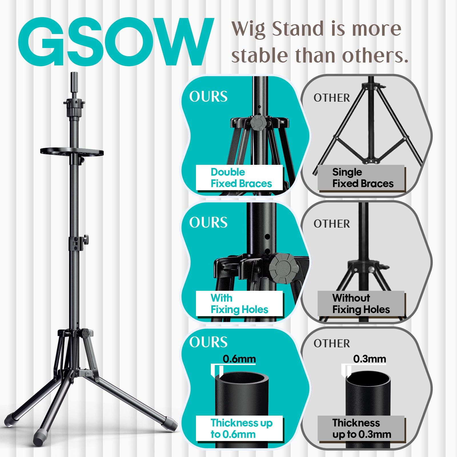 GSOW Wig Stand Tripod - Reinforced Metal Mannequin Head Stand with Tool Tray, Adjustable Height 31" - 57" Wig Head Stand for Styling Cosmetology Hairdressing Training with Wig Caps T-Pins Hair Clips