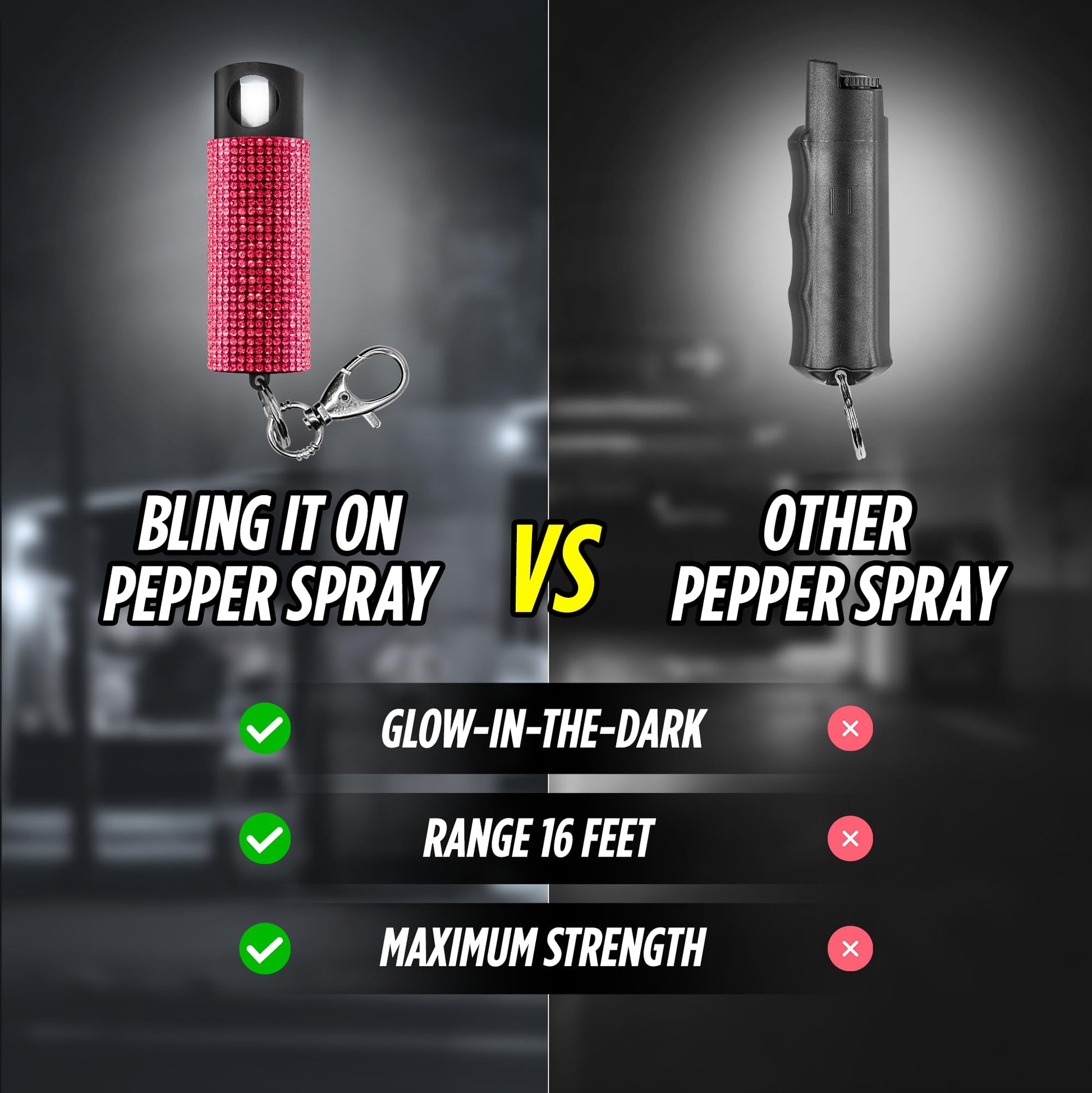 - FASHION AND POWER IN ONE - The Bling It On pepper spray from Guard Dog Security offers a stylish and secure solution for self-defense. This pepper spray keychain set combines style and strength, providing users with a fashionable and elegant look while ensuring maximum stopping power with its lab-tested 1.44 MC formulation