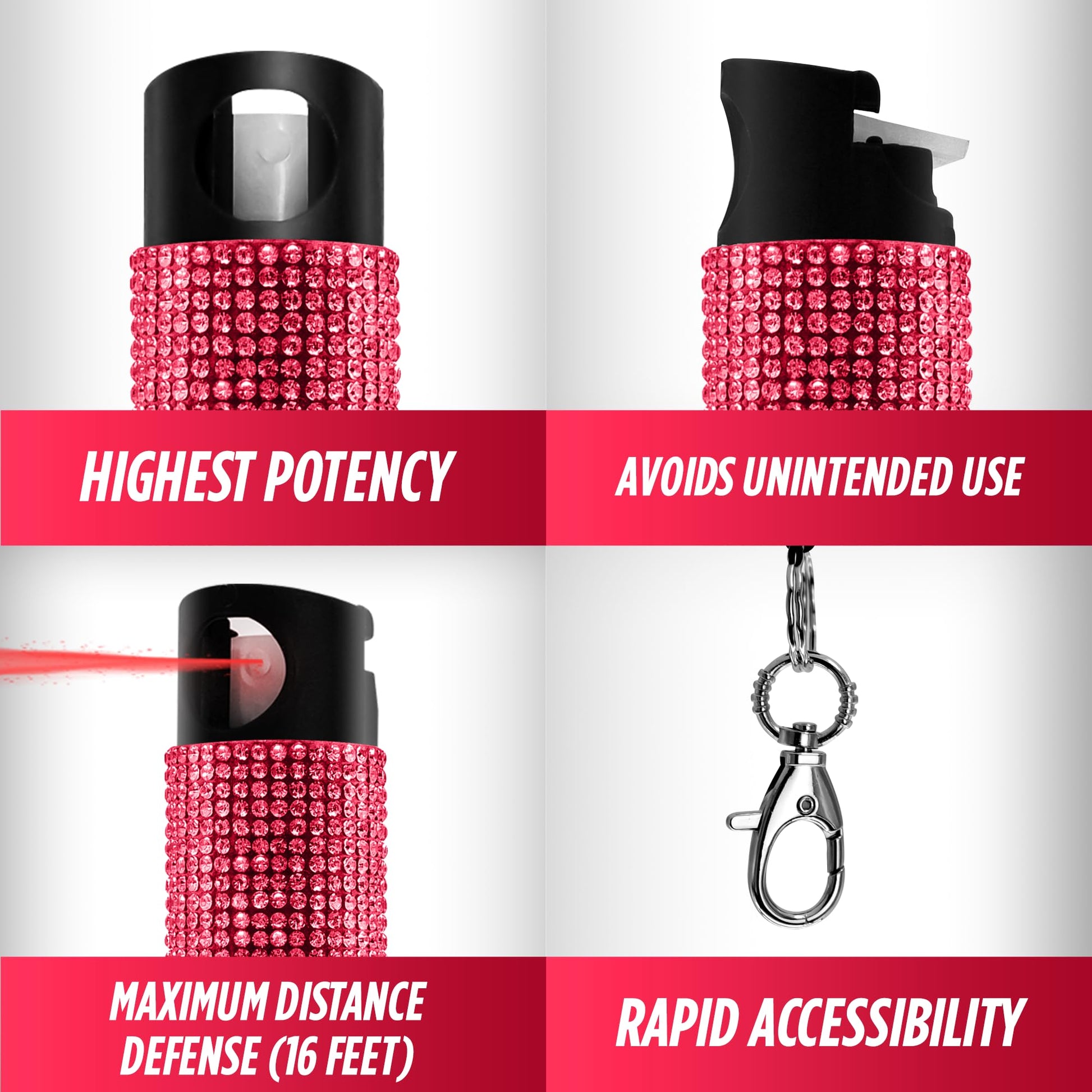 Providing personal protection and increased confidence in the most stylish form, this keychain pepper spray gives you easily accessible, concealed and immediate protection from a potential attacker. Clipping easily to your keychain, purse or backpack, the fashionable self-defense accessory is adorned with rhinestones to coordinate with your personal style, while giving you the ability to immediately disable an attacker.