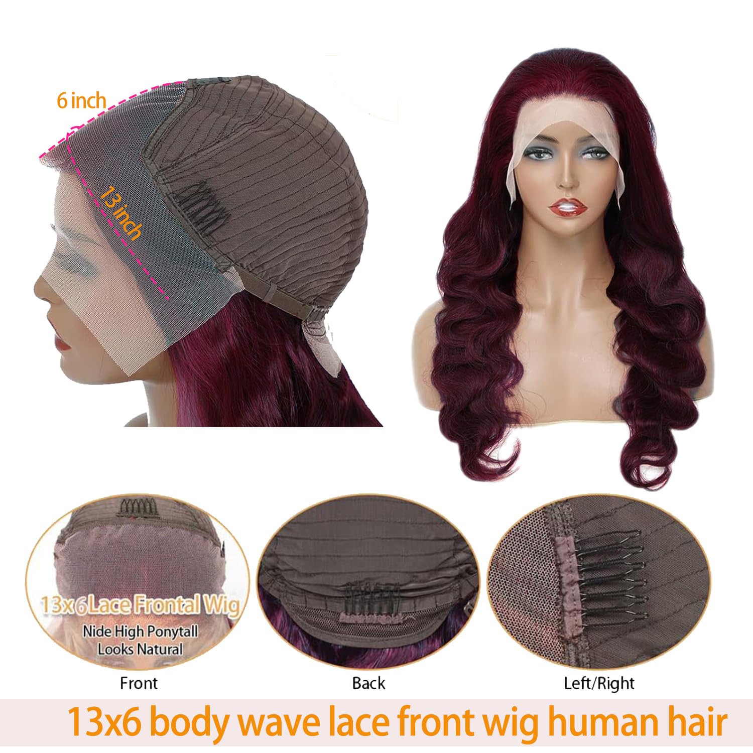 - 13x6 99j Body Wave Wig Feature: 13x6 HD Transparent Lace Front Wigs for Women Can Match all Skin Well, Breathable &Comfortable, Looks Natural & Realistic as Your Own Hair. can be parted into middle part or side part, can do half up half down styles, ponytail & bun.