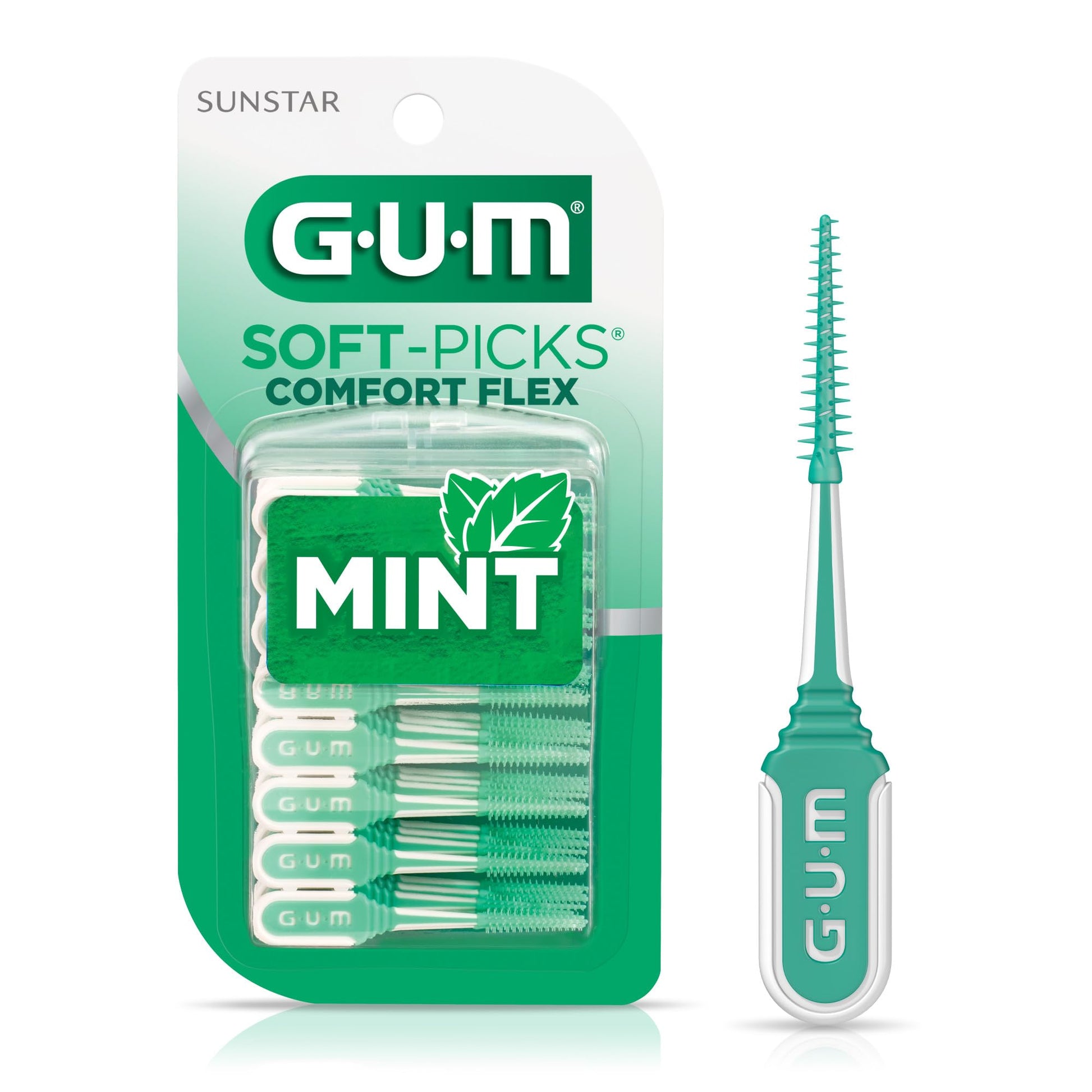 Details: Going beyond brushing has never been easier. Research continues to show the connection between oral health and overall health. Cleaning between your teeth every day is the most important thing you can do to keep plaque and food from accumulating in hard-to-reach spaces. Meet GUM Comfort Flex Soft Picks. The perfect portable interdental brushes for oral care on-the-go. Each of our dental picks feature ultra-soft, rubber bristles that gently & effectively remove plaque and food particles for cleaner teeth, healthier gums, and fresher breath. What sets Comfort Flex Soft Picks apart? New invigorating mint flavor Rubber coated, ergonomic handle for easier grip Safe for sensitive gums Latex, wood, and wire free Discreet & Disposable + Convenient plastic carry case New & Improved stronger picks Dentists and Hygienists alike recommend soft picks as an effective way to clean hard to reach areas in your mouth. Our Comfort Flex style picks are especially well suited for food removal and teeth cleaning for those with small interdental spaces, braces, bridges, or orthodontic appliances. GUM Soft Picks make it easy to carry good oral hygiene with you wherever you go. Each dental pick comes in a discreet size and is packed in a convenient plastic carrying case that fits easily into handbags, pockets, and glove boxes. Now that’s something to smile about!