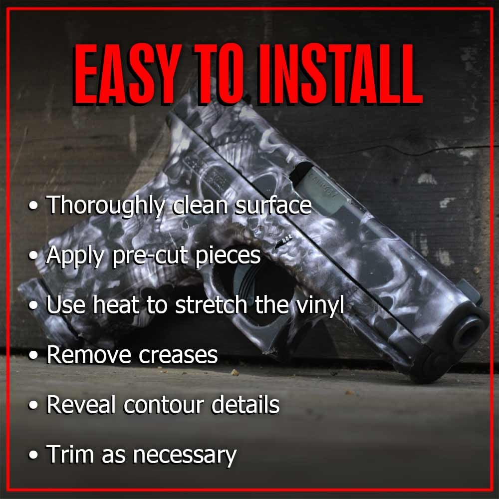 - FITS ANY HANDGUN - Pistol Skins conform to any shape. Designed to fit any semi-automatic pistols with a barrel length of eight inches or less. Also can be installed on revolvers, airsoft, bb and paintball guns, too! Comes with two 4.75' x 8' frame pieces and one 3.75' x 8' slide piece.