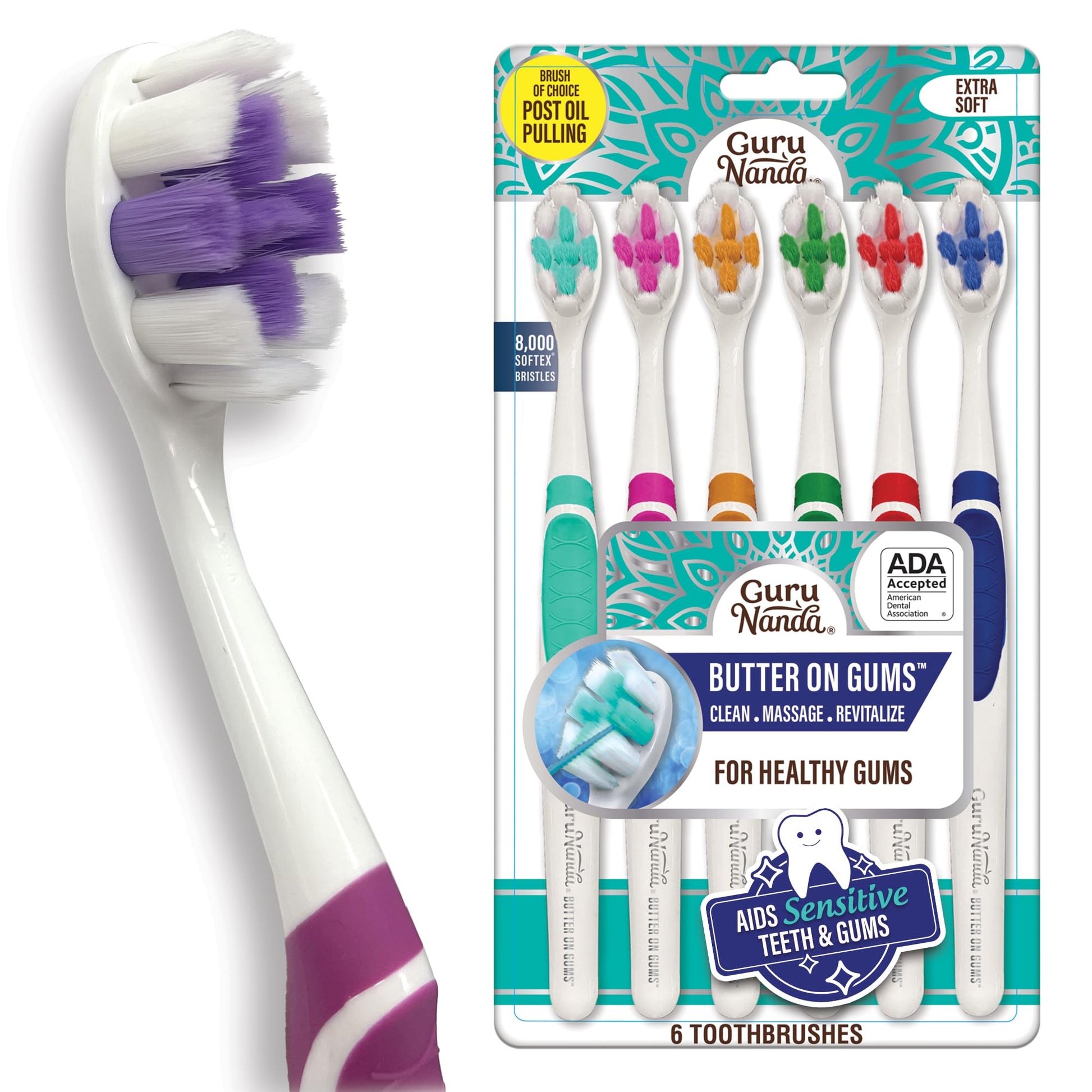- EXTRA SOFT BRISTLES FOR SENSITIVE GUMS: GuruNanda Butter on Gums Toothbrush (6-count) is made with 8000+ SoftexTM bristles technology, which compromises of ultra-soft bristles, to help slow down gum recession, and are gentle for sensitive teeth. Our Butter on Gums toothbrush has smooth-ended bristles that gently remove food particles and plaque while polishing the teeth.