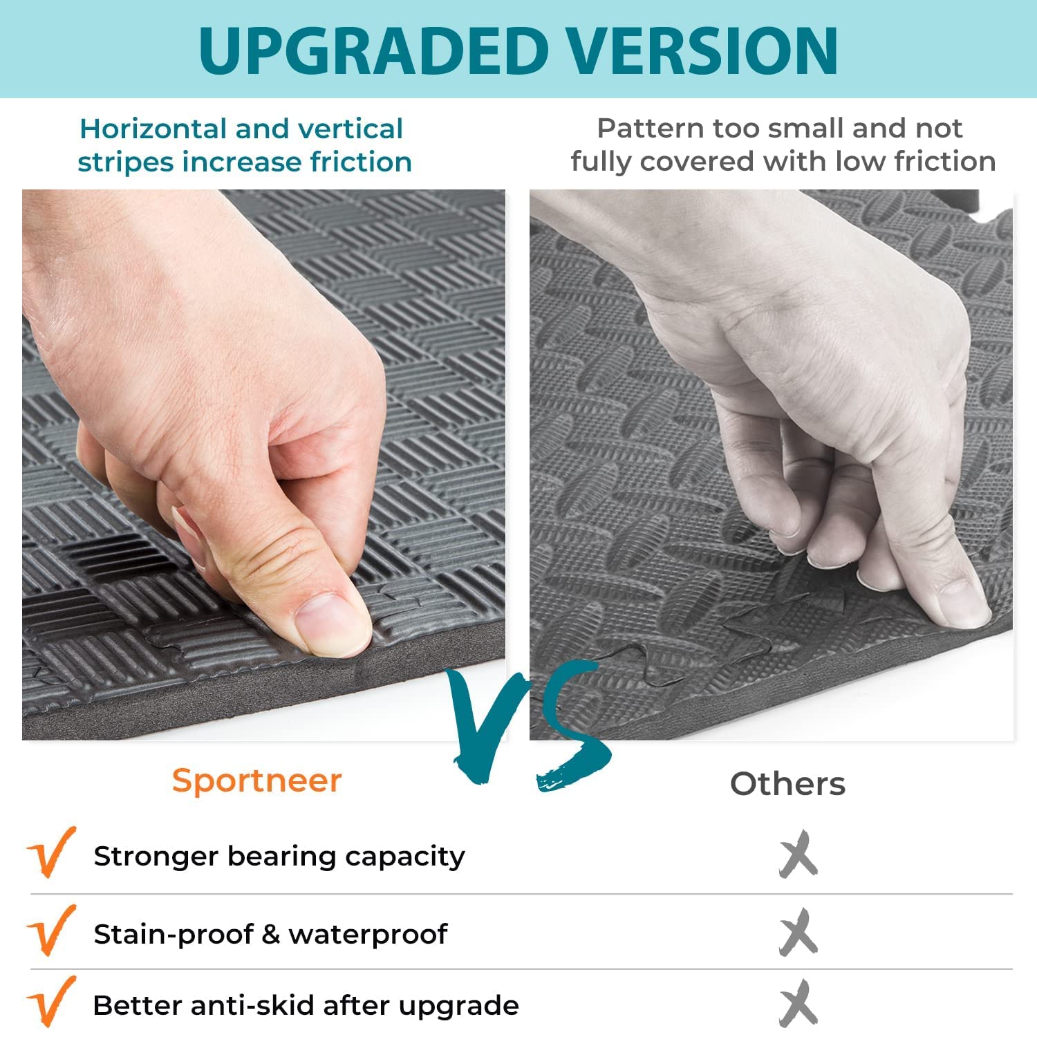 - Optimum Surface Protection: Sportneer exercise floor mat can protect your floors from scratches, dents, liquids, pets, children and more! The 12-piece Sportneer Ground Protector is durable, lightweight and non-skid for use anywhere indoors