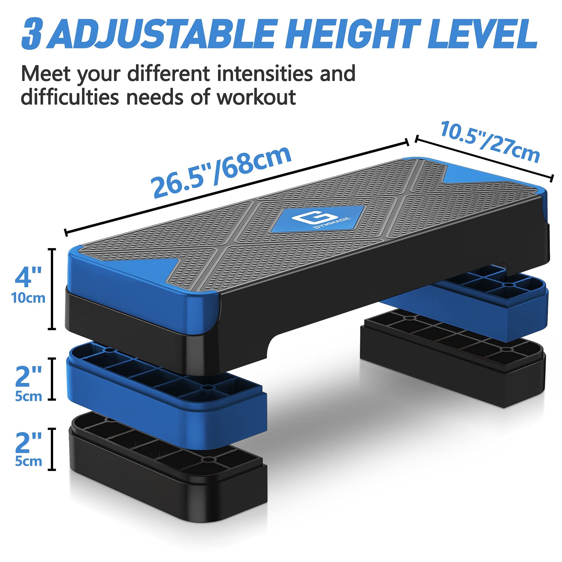- UPGRADED 3 EASY ADJUSTABLE HIGHT: GYMMAGE Aerobic Stepper comes with 26.5' x 10.5' wide platform and 4 risers (2 pairs of risers). Intensify workout difficulty by adjusting platform height from 4” to 6” to 8” using risers to challenge yourself. Perfect for any levels of user of all ages
