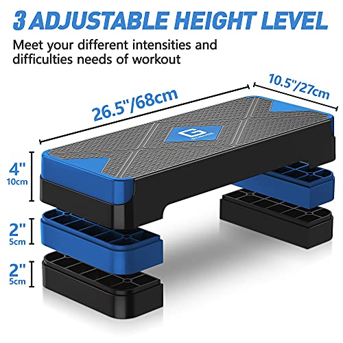 - UPGRADED 3 EASY ADJUSTABLE HIGHT: GYMMAGE Aerobic Stepper comes with 26.5' x 10.5' wide platform and 4 risers (2 pairs of risers). Intensify workout difficulty by adjusting platform height from 4” to 6” to 8” using risers to challenge yourself. Perfect for any levels of user of all ages