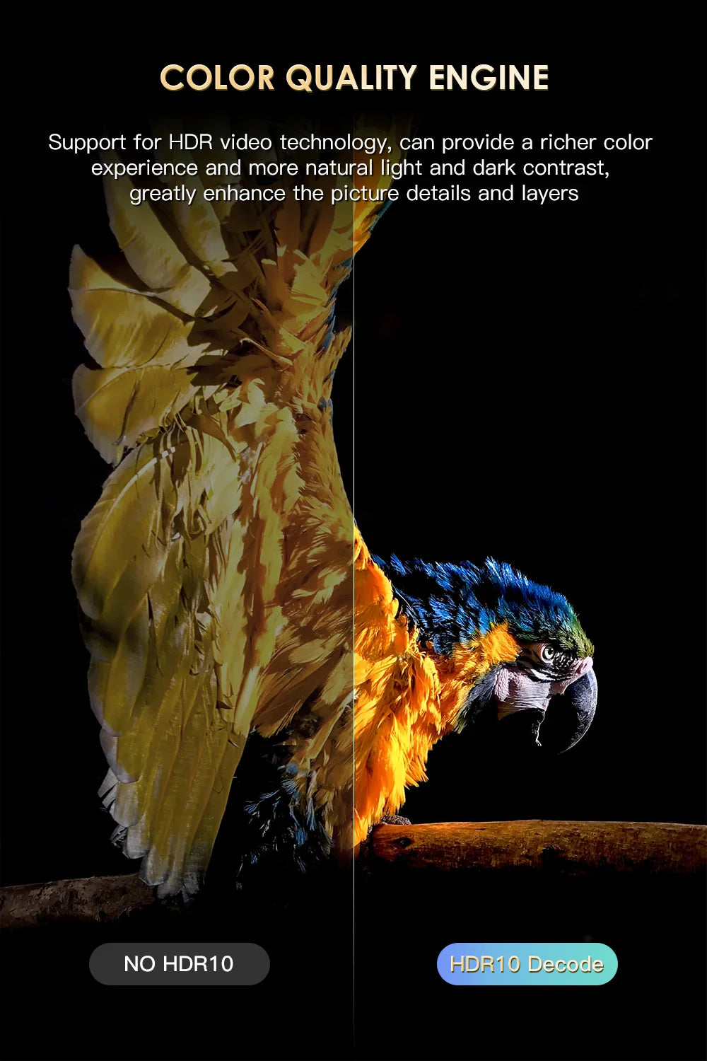 Support for HDR video technology, can provide a richer color experience and more natural light and dark contrast,greatly enhance the picture details and layers