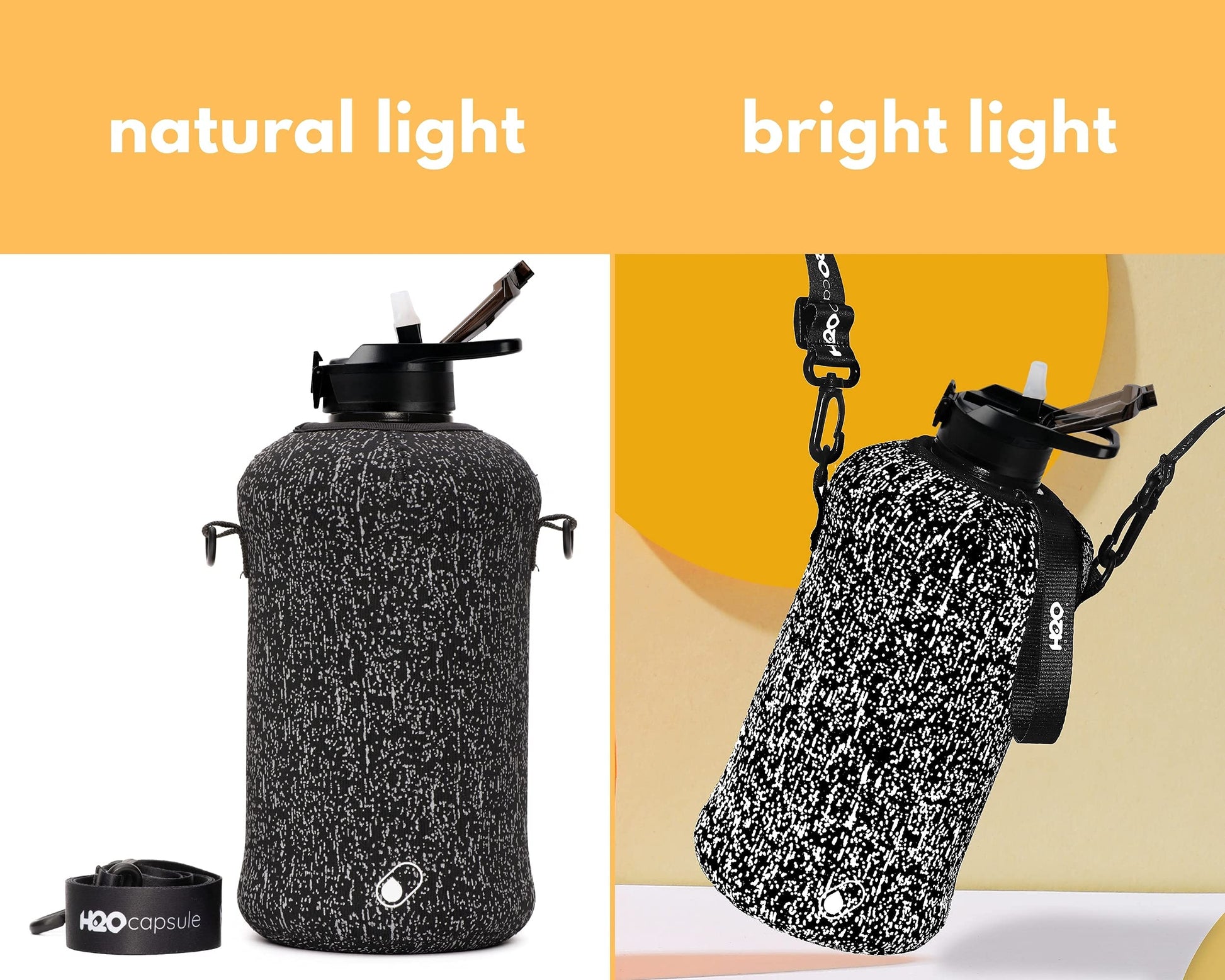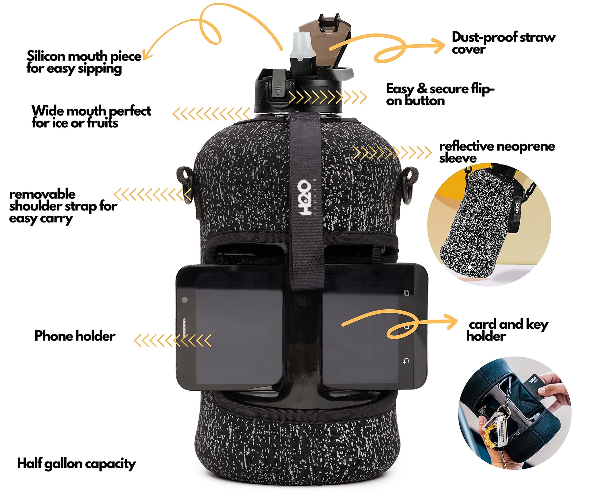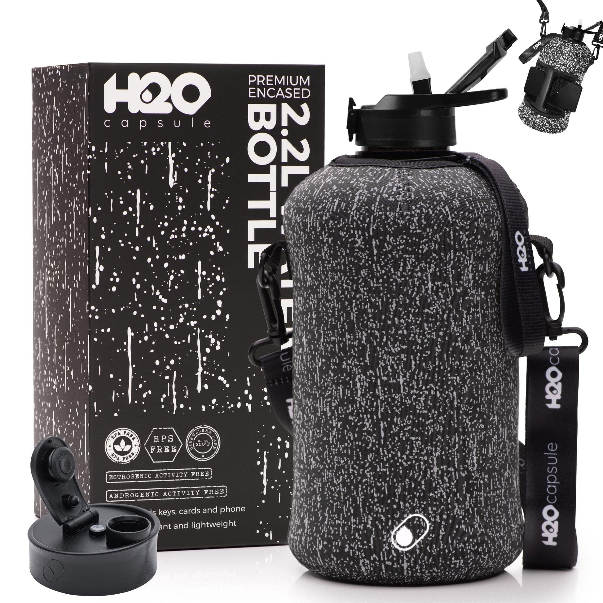 Details: The Encased Drink Bottle That Holds Your Stuff While YOU Work Out!It’s a bodybuilding, yoga lovers and gym bunny conundrum –where DO you put your cell phone, keys, ID and cards when you train? Who wants to leave their phone in a locker, when it holds those pumping workout tunes! You CAN carry it but that fumbling and leaving it on filthy gym floors is not cool, right?Well, it’s not a problem for H2O Capsule. The FIRST and ONLY water bottle with a storage holder for keeping your stuff safe while YOU get your sweat on (and then re-hydrate)! The thick 5mm insulated sleeve protects your bottle, while carrying your things! There’s a band for your phone, slot for your cards and keyring for your keys behind the container’s large handle, and the sports bottle’s sleeve also features a removable shoulder strap, making carrying your water even easier and saving space in your gym bag.And here’s what else you’ll love…This half gallon water bottle is now made of 30% thicker plastic, and comes with a leak-proof and dust-proof covered straw lid which helps protect the mouthpiece, and flips open with a click of a button! The2.25” wide mouth is perfect for adding ice cubes to your sports drink, and the insulated 5mm thick neoprene sleeve helps them stay cold for longer.The H2O Capsule – Gym Bottle AND Heavy Duty Storage! - Half Gallon Water Bottle with Handle- 5mm Thick Soft Neoprene Thermal Sleeve WITH Patented Cell Phone Holder, Keyring AND Card Holder- Leak-proof Covered Straw Lid with Wide Mouth Access (2.25” wide)- BPA and BPS Free, Food Safe Half Gallon Jug- Available in Multiple Colors and Designs- 2.2 Liter Water Bottle Supported by our 12-Month Warranty The straw-lid is air-sealed: Run straw brush through mouth piece before initial use.Let everyone else struggle with their carrying their stuff in the gym… because you no longer have to with the revolutionary H2O Capsule
