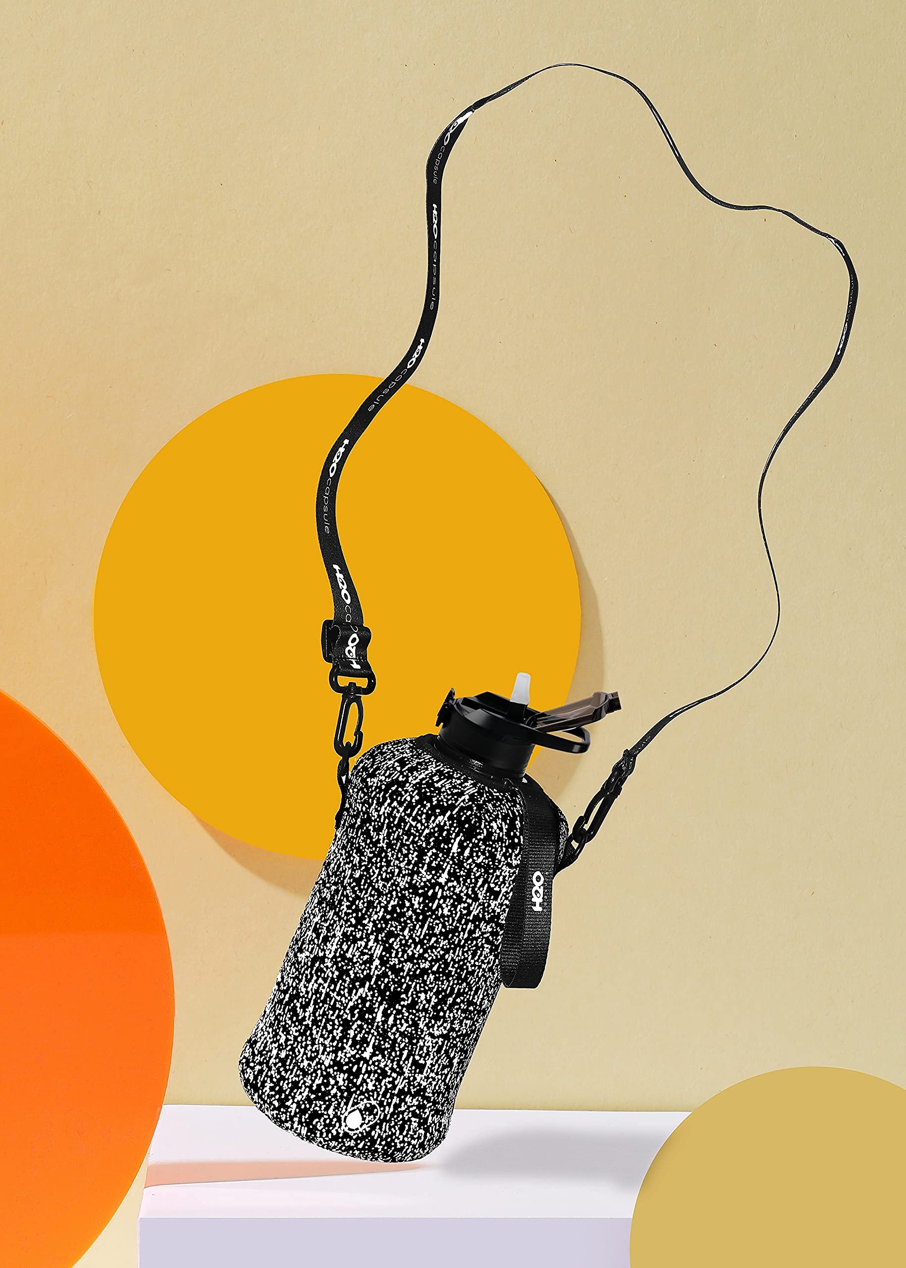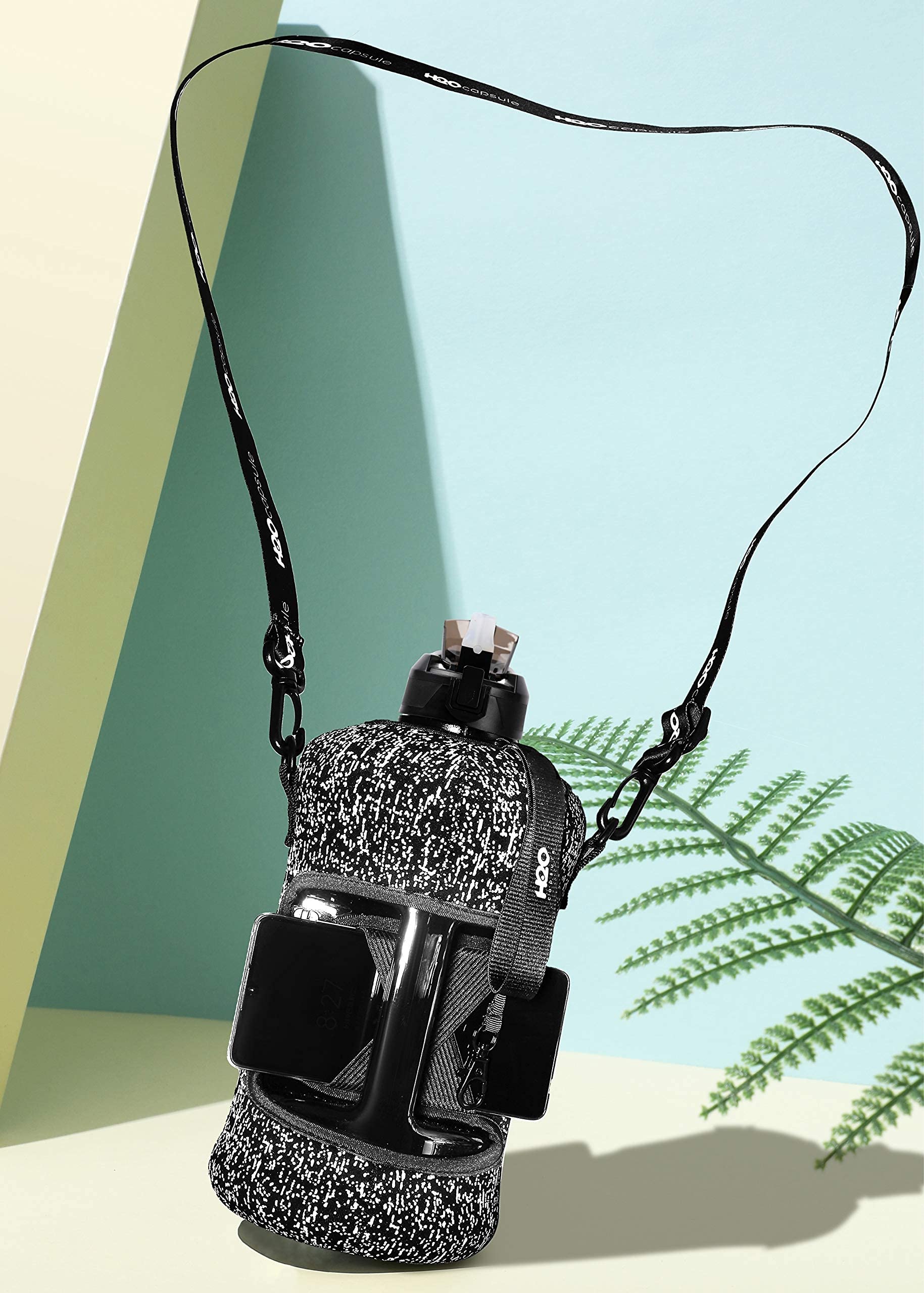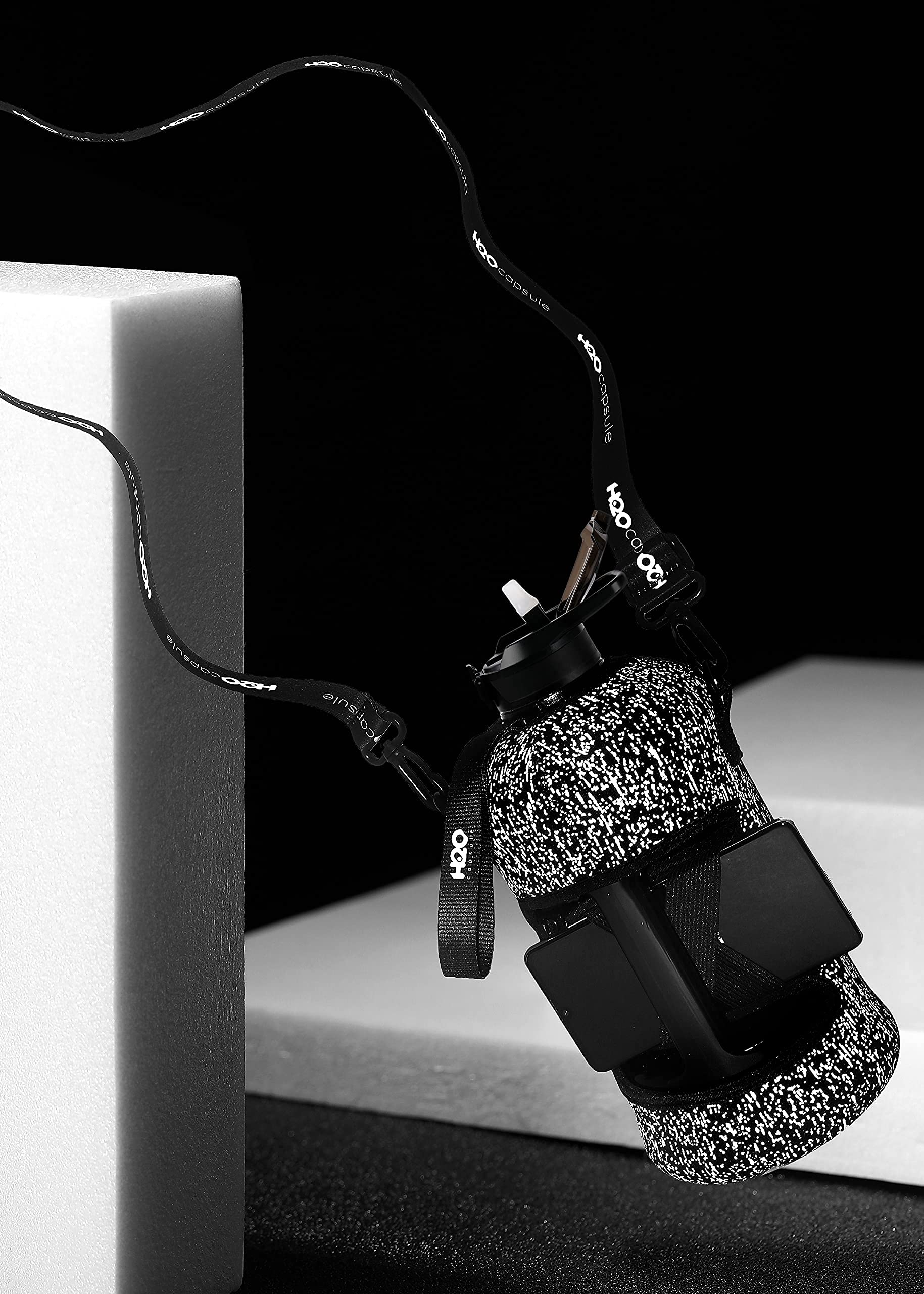 Details: The Encased Drink Bottle That Holds Your Stuff While YOU Work Out!It’s a bodybuilding, yoga lovers and gym bunny conundrum –where DO you put your cell phone, keys, ID and cards when you train? Who wants to leave their phone in a locker, when it holds those pumping workout tunes! You CAN carry it but that fumbling and leaving it on filthy gym floors is not cool, right?Well, it’s not a problem for H2O Capsule. The FIRST and ONLY water bottle with a storage holder for keeping your stuff safe while YOU get your sweat on (and then re-hydrate)! The thick 5mm insulated sleeve protects your bottle, while carrying your things! There’s a band for your phone, slot for your cards and keyring for your keys behind the container’s large handle, and the sports bottle’s sleeve also features a removable shoulder strap, making carrying your water even easier and saving space in your gym bag.And here’s what else you’ll love…This half gallon water bottle is now made of 30% thicker plastic, and comes with a leak-proof and dust-proof covered straw lid which helps protect the mouthpiece, and flips open with a click of a button! The2.25” wide mouth is perfect for adding ice cubes to your sports drink, and the insulated 5mm thick neoprene sleeve helps them stay cold for longer.The H2O Capsule – Gym Bottle AND Heavy Duty Storage! - Half Gallon Water Bottle with Handle- 5mm Thick Soft Neoprene Thermal Sleeve WITH Patented Cell Phone Holder, Keyring AND Card Holder- Leak-proof Covered Straw Lid with Wide Mouth Access (2.25” wide)- BPA and BPS Free, Food Safe Half Gallon Jug- Available in Multiple Colors and Designs- 2.2 Liter Water Bottle Supported by our 12-Month Warranty The straw-lid is air-sealed: Run straw brush through mouth piece before initial use.Let everyone else struggle with their carrying their stuff in the gym… because you no longer have to with the revolutionary H2O Capsule