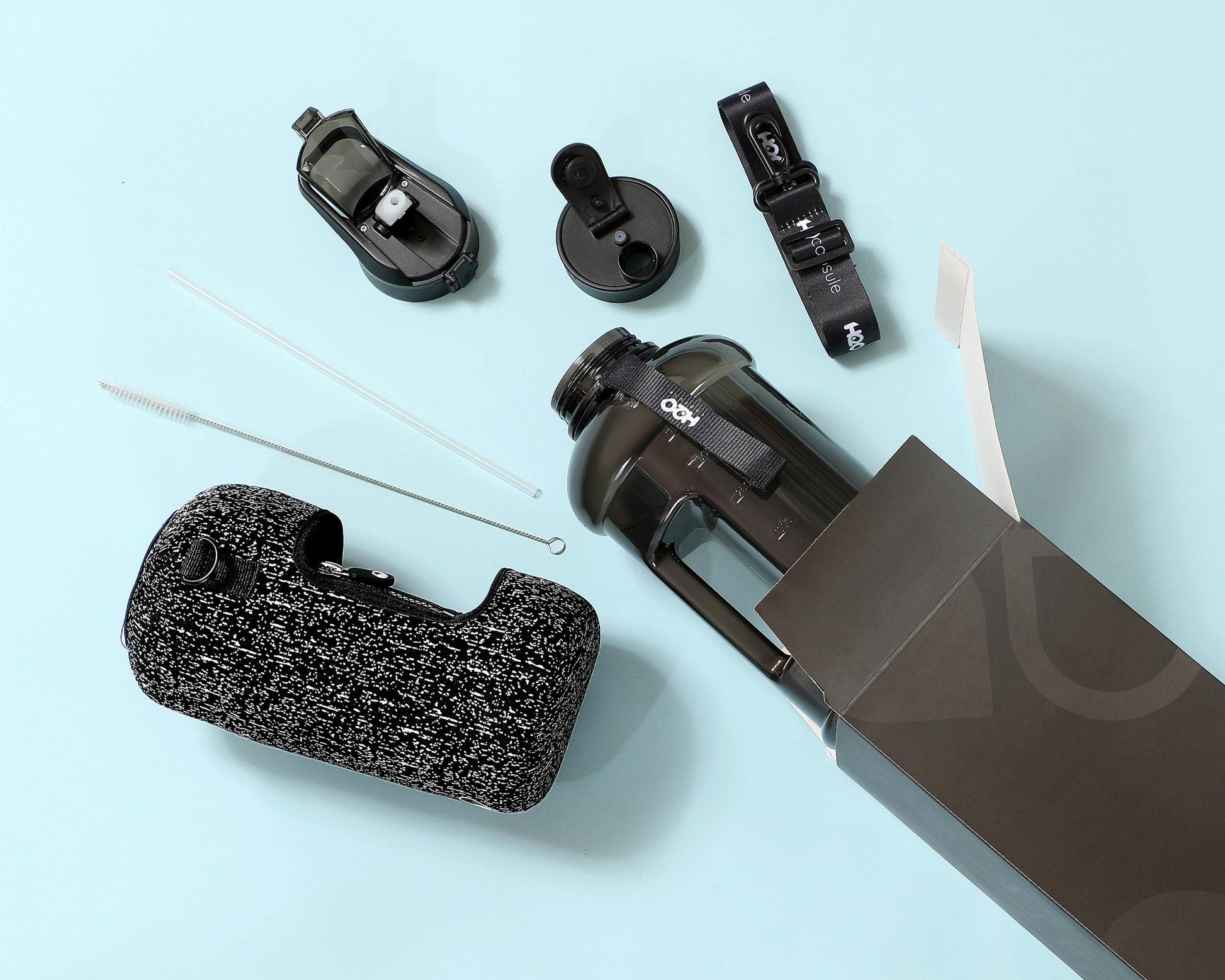 - HALF GALLON HYDRATION WITH COVERED STRAW LID: The extra large 2.2L / 74 oz plastic jug holds all the water you need to stay hydrated while you exercise. The reusable half gallon comes with a leak-proof & dust-proof covered straw lid, which helps protect the mouthpiece and flips open with a click of a button. The straw-lid is air-sealed: Run straw brush through mouth piece before initial use. The H2O Capsule bottle with storage sleeve comes with a bonus straw cleaning brush.