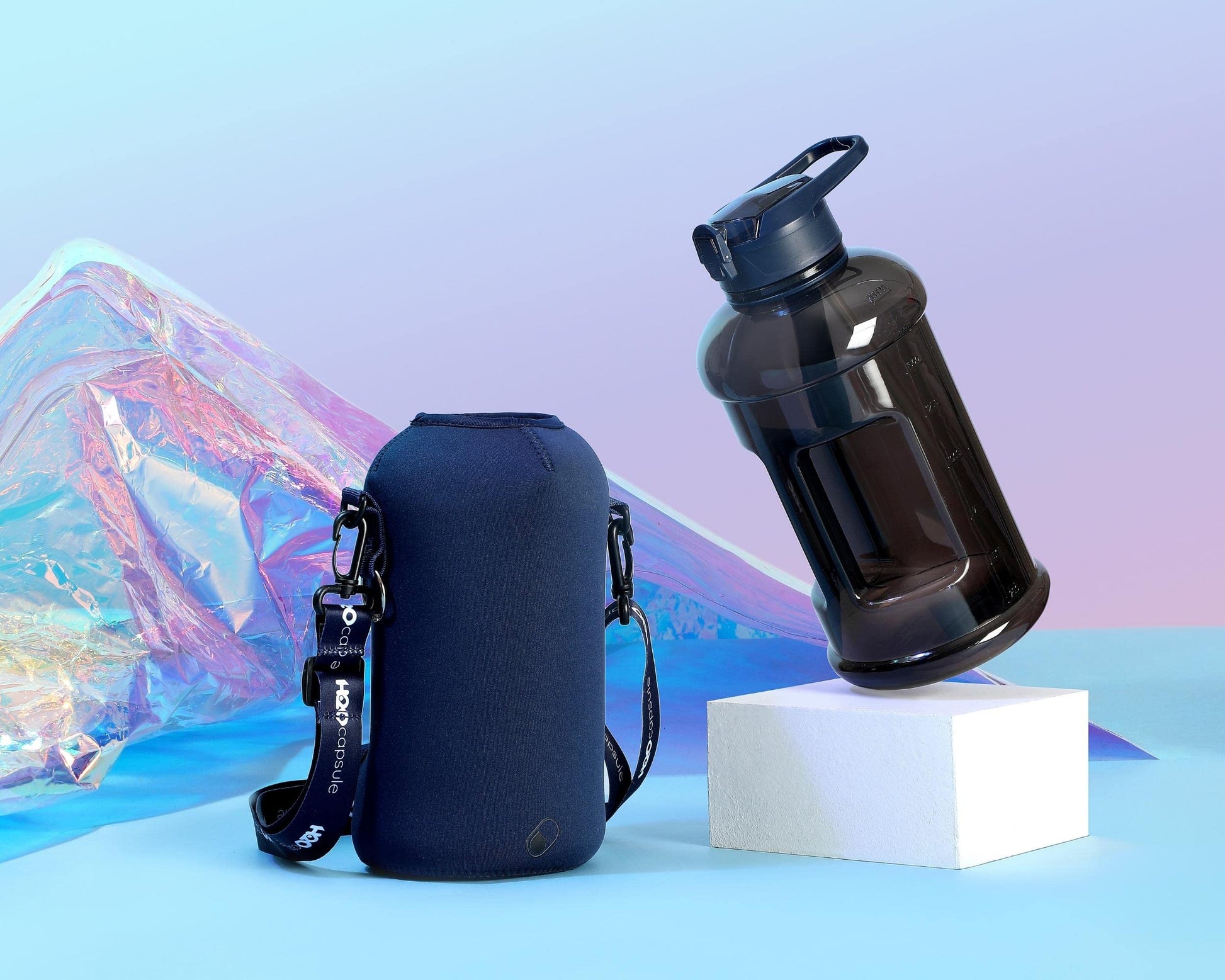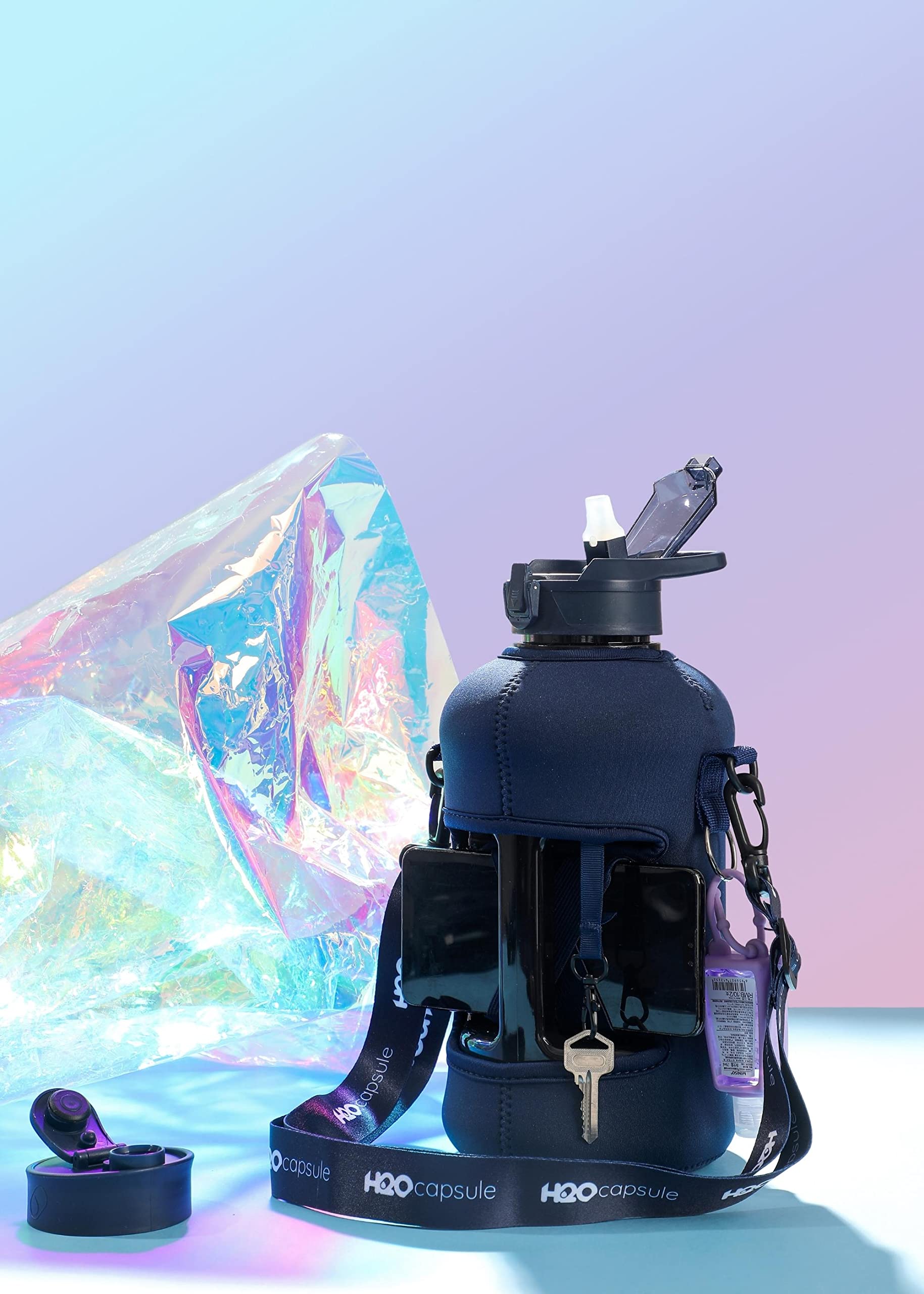 Details: The Encased Drink Bottle That Holds Your Stuff While YOU Work Out!It’s a bodybuilding, yoga lovers and gym bunny conundrum –where DO you put your cell phone, keys, ID and cards when you train? Who wants to leave their phone in a locker, when it holds those pumping workout tunes! You CAN carry it but that fumbling and leaving it on filthy gym floors is not cool, right?Well, it’s not a problem for H2O Capsule. The FIRST and ONLY water bottle with a storage holder for keeping your stuff safe while YOU get your sweat on (and then re-hydrate)! The thick 5mm insulated sleeve protects your bottle, while carrying your things! There’s a band for your phone, slot for your cards and keyring for your keys behind the container’s large handle, and the sports bottle’s sleeve also features a removable shoulder strap, making carrying your water even easier and saving space in your gym bag.And here’s what else you’ll love…This half gallon water bottle is now made of 30% thicker plastic, and comes with a leak-proof and dust-proof covered straw lid which helps protect the mouthpiece, and flips open with a click of a button! The2.25” wide mouth is perfect for adding ice cubes to your sports drink, and the insulated 5mm thick neoprene sleeve helps them stay cold for longer.The H2O Capsule – Gym Bottle AND Heavy Duty Storage! - Half Gallon Water Bottle with Handle- 5mm Thick Soft Neoprene Thermal Sleeve WITH Patented Cell Phone Holder, Keyring AND Card Holder- Leak-proof Covered Straw Lid with Wide Mouth Access (2.25” wide)- BPA and BPS Free, Food Safe Half Gallon Jug- Available in Multiple Colors and Designs- 2.2 Liter Water Bottle Supported by our 12-Month Warranty The straw-lid is air-sealed: Run straw brush through mouth piece before initial use.Let everyone else struggle with their carrying their stuff in the gym… because you no longer have to with the revolutionary H2O Capsule