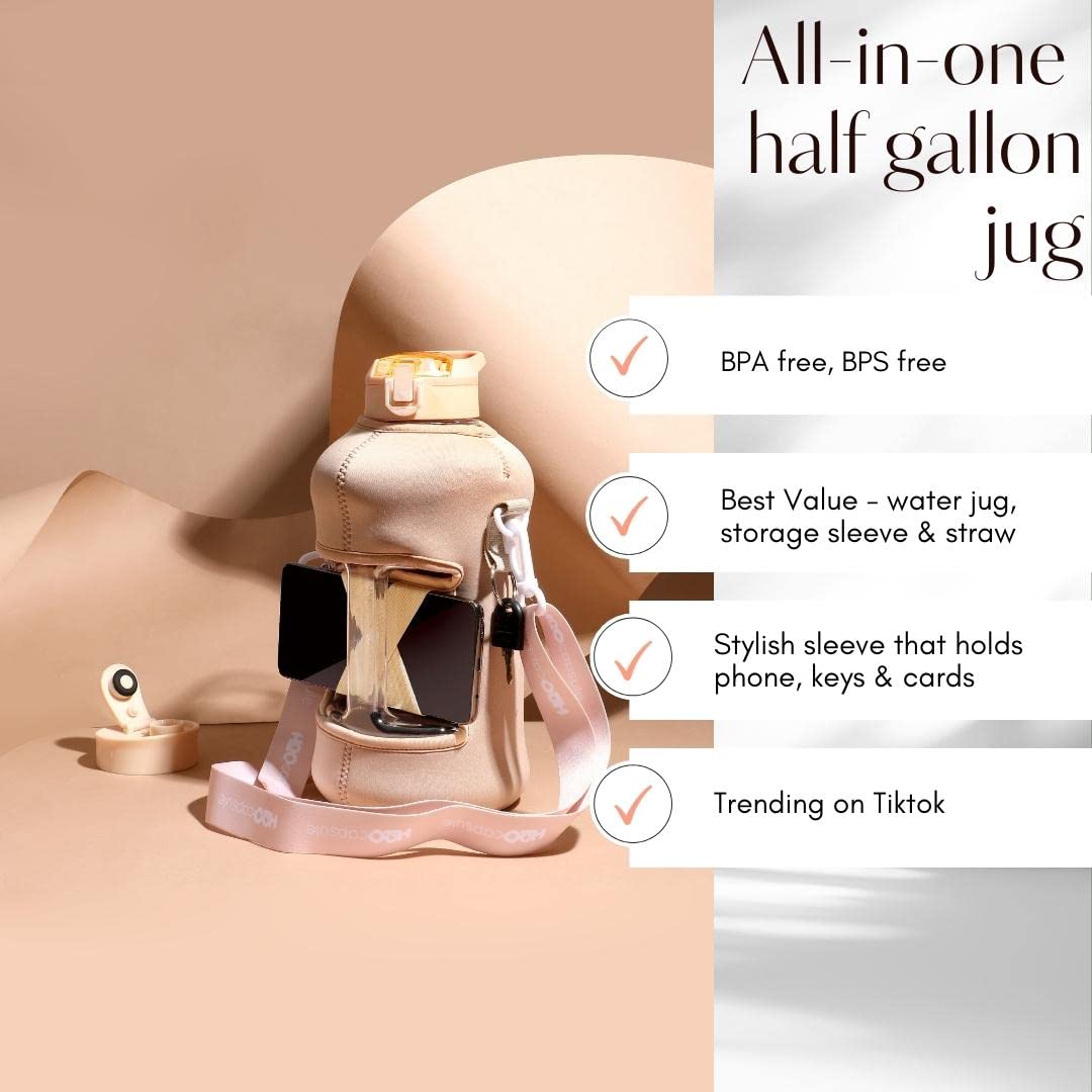 H2O Capsule 2.2L Half Gallon Water Bottle with Storage Sleeve and Covered Straw Lid – BPA Free Large Reusable Drink Container with Handle - Big Sports Jug, 2.2 Liter (74 Ounce), Sandy Beige