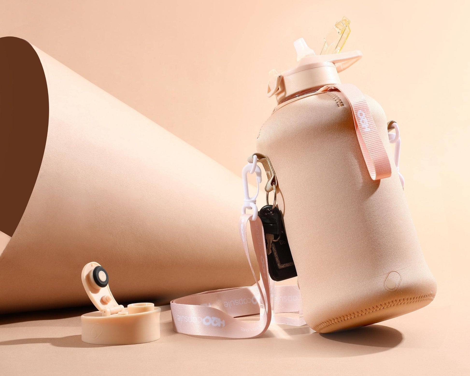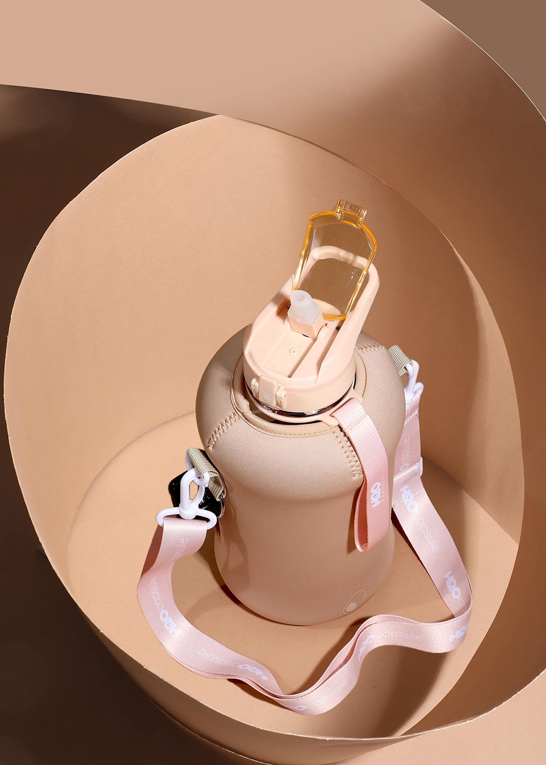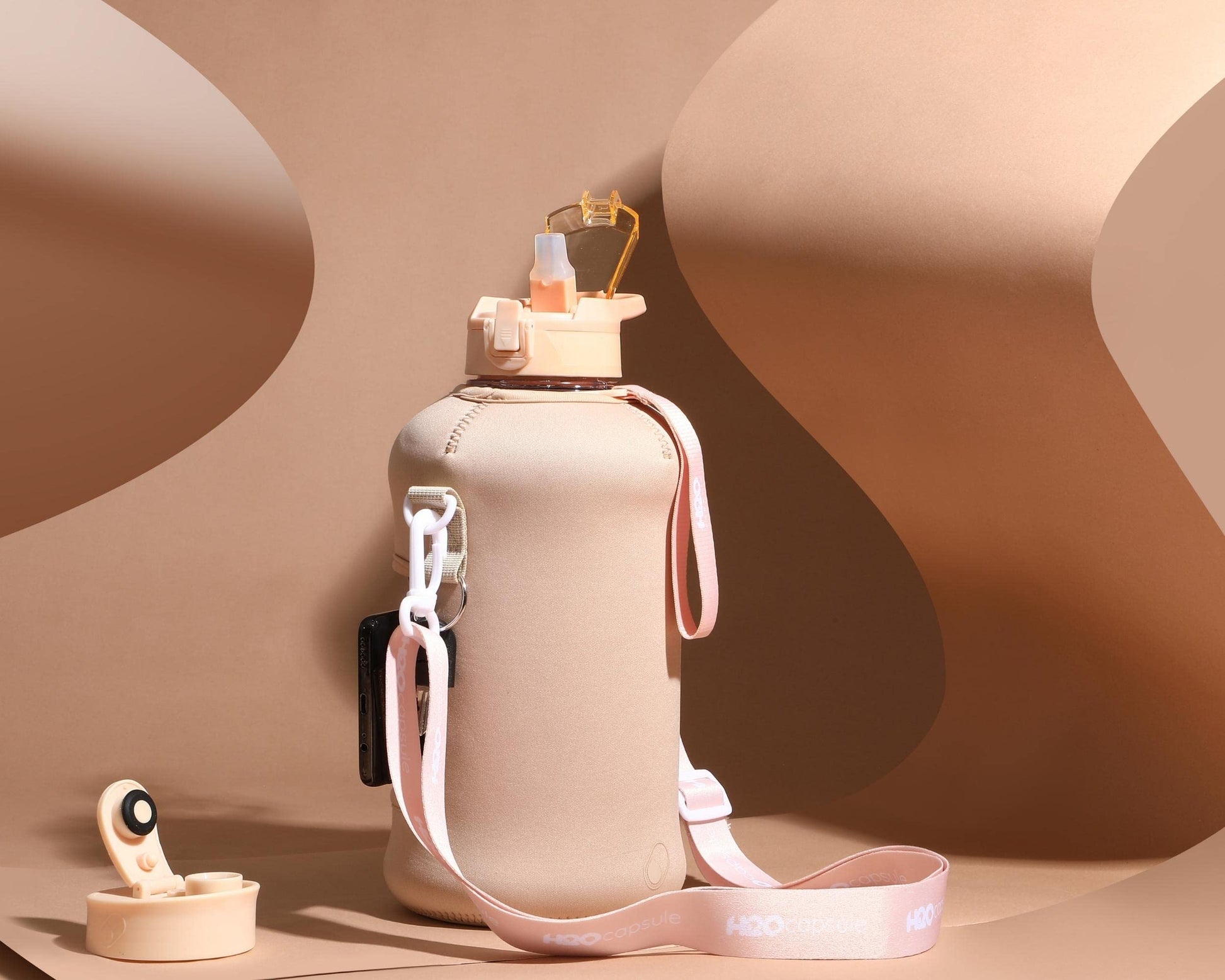Well, it’s not a problem for H2O Capsule. The FIRST and ONLY water bottle with a storage holder for keeping your stuff safe while YOU get your sweat on (and then re-hydrate)! The thick 5mm insulated sleeve protects your bottle, while carrying your things! There’s a band for your phone, slot for your cards and keyring for your keys behind the container’s large handle, and the sports bottle’s sleeve also features a removable shoulder strap, making carrying your water even easier and saving space in your gym bag.
