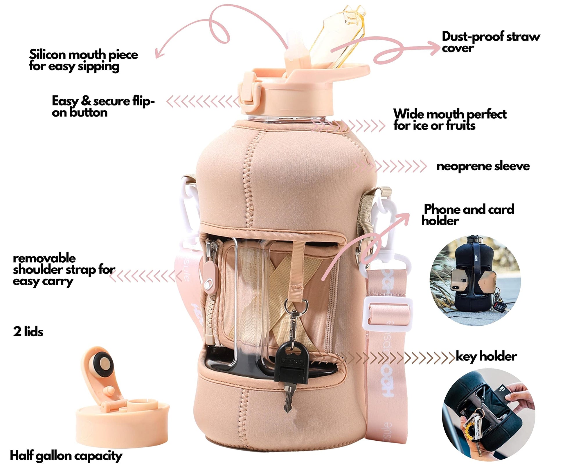 This half gallon water bottle is now made of 30% thicker plastic, and comes with a leak-proof and dust-proof covered straw lid which helps protect the mouthpiece, and flips open with a click of a button! The2.25” wide mouth is perfect for adding ice cubes to your sports drink, and the insulated 5mm thick neoprene sleeve helps them stay cold for longer.