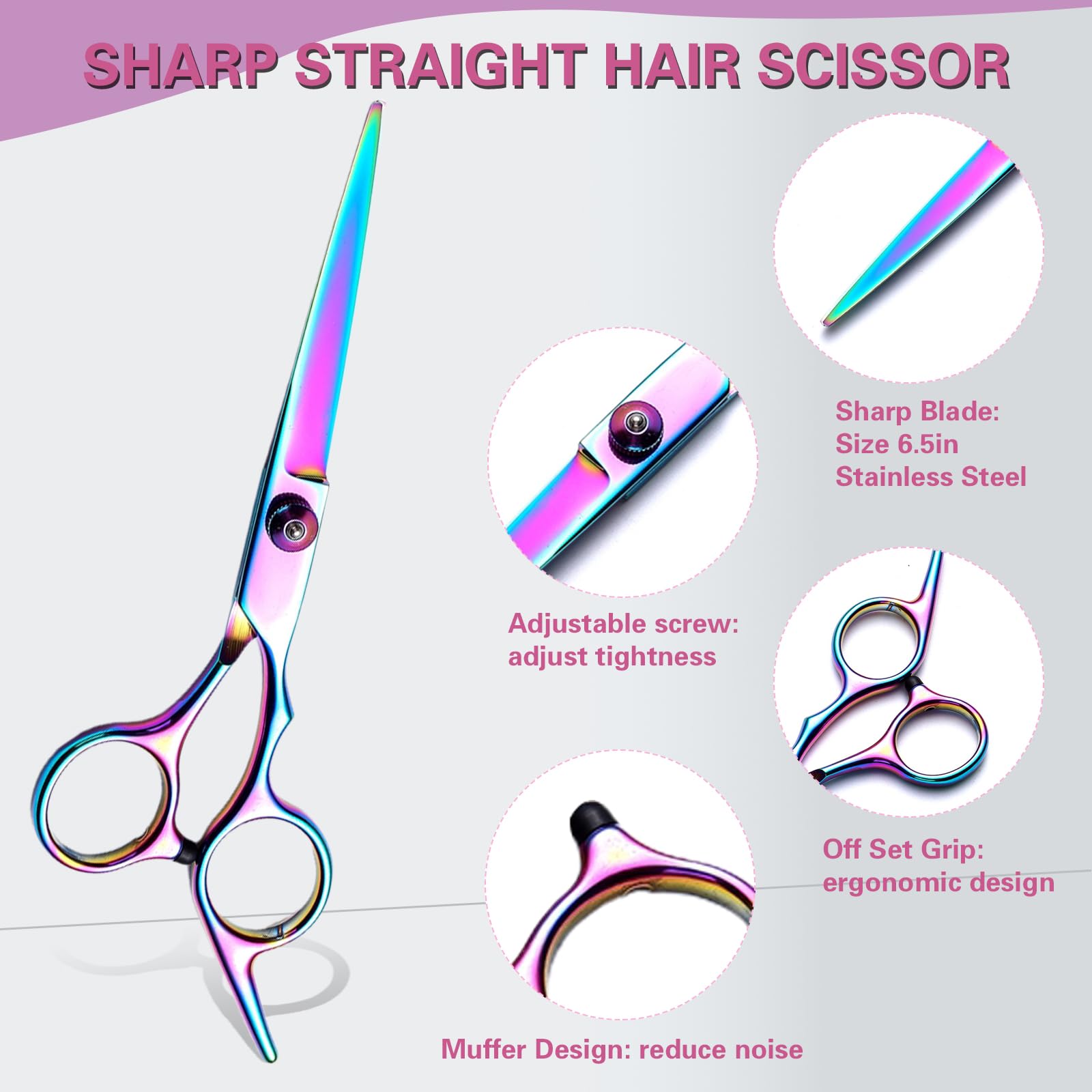 - 🏅PROFESSIONAL COATING: Hair scissors are made with latest design, ideal for both professional and personal uses. Wipe the hair shears with the cleaning cloth after each use and keep away from water, hair cutting scissors would stay sharp and long-lasting. Professional coating prevents the steel of haircut scissors from being rust, makes the barber scissors durable, glossy and shiny as well.