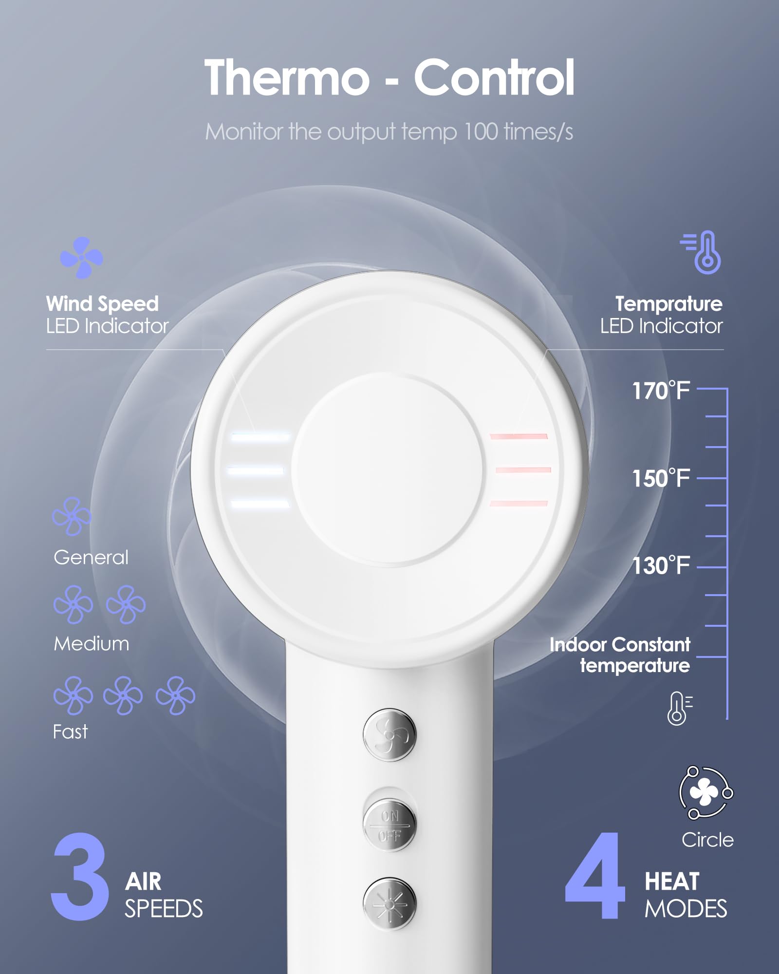 - [Perfect for All Hair Type] Our hair dryer is equipped with 4 temperature settings and 3 speed options, allowing you to find the most comfortable drying experience tailored to your needs. Whether your hair is curly, thick, or fine, it adapts seamlessly to provide optimal care. Additionally, it features an smart intelligent temperature control sensor that adjusts the temperature 100 times per second, maintaining a consistent heat level to keep your hair drying without damage