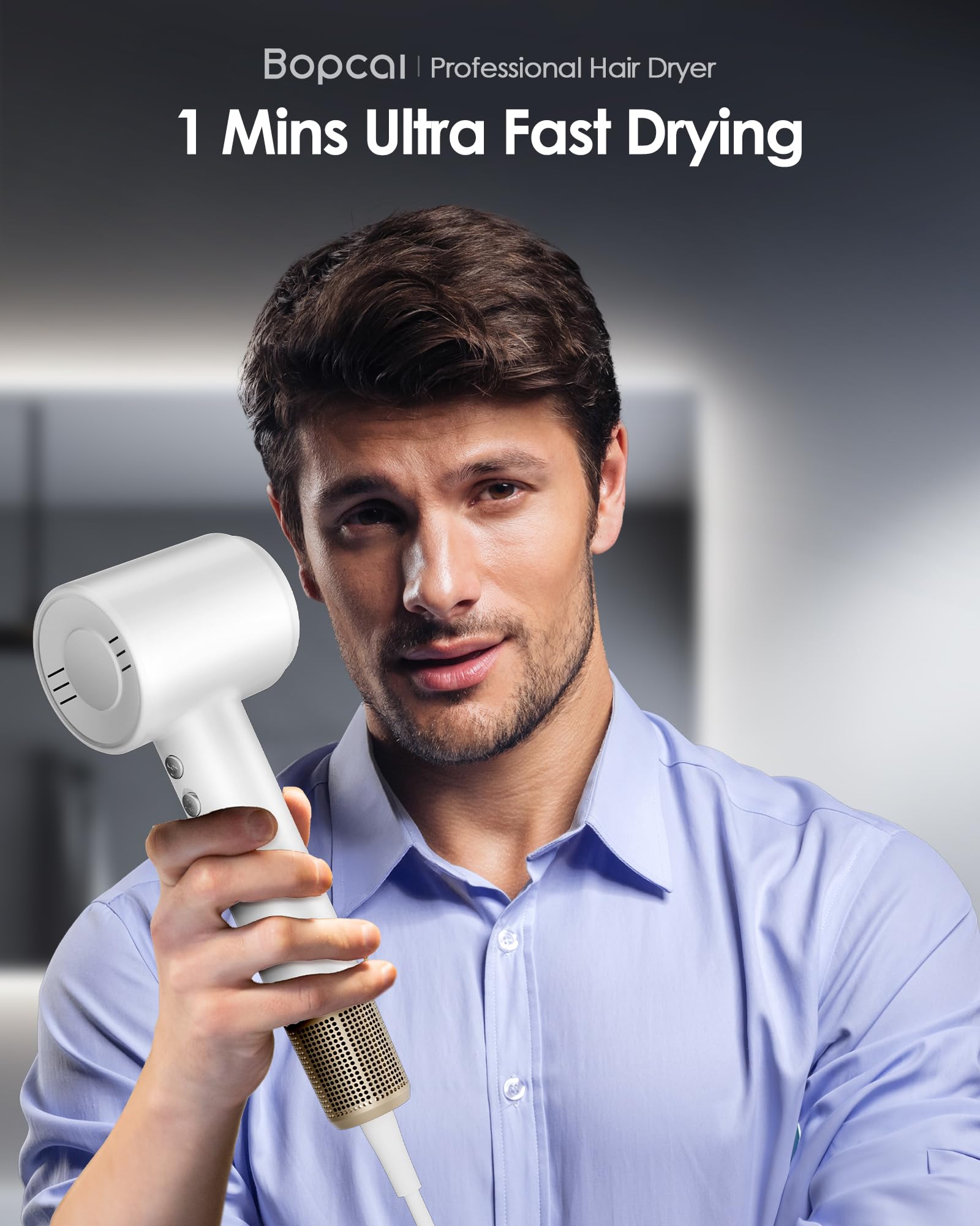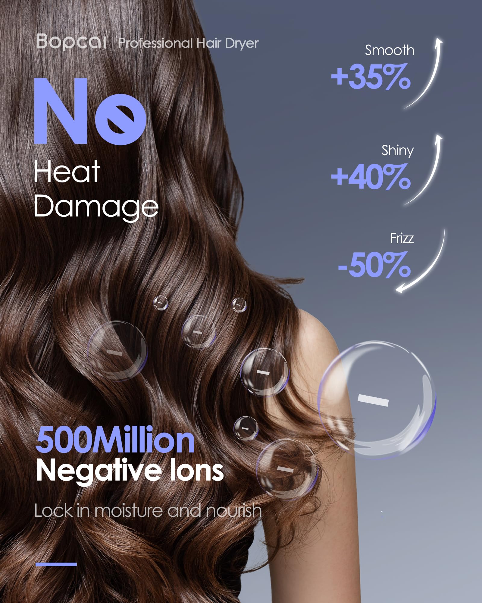 - [A Game-changer Hair Dryer!] A truly hair care dryer, Bopcal hair dryer generates powerful airflow that is five times faster than typical dryers. With cutting-edge technology releasing 500 million negative ions and an intelligent temperature control system, it delivers professional results, leaving your hair smooth, frizz-free, and no heat damage. Upgrade your daily routine with the Bopcal blow dryer for consistently beautiful hair