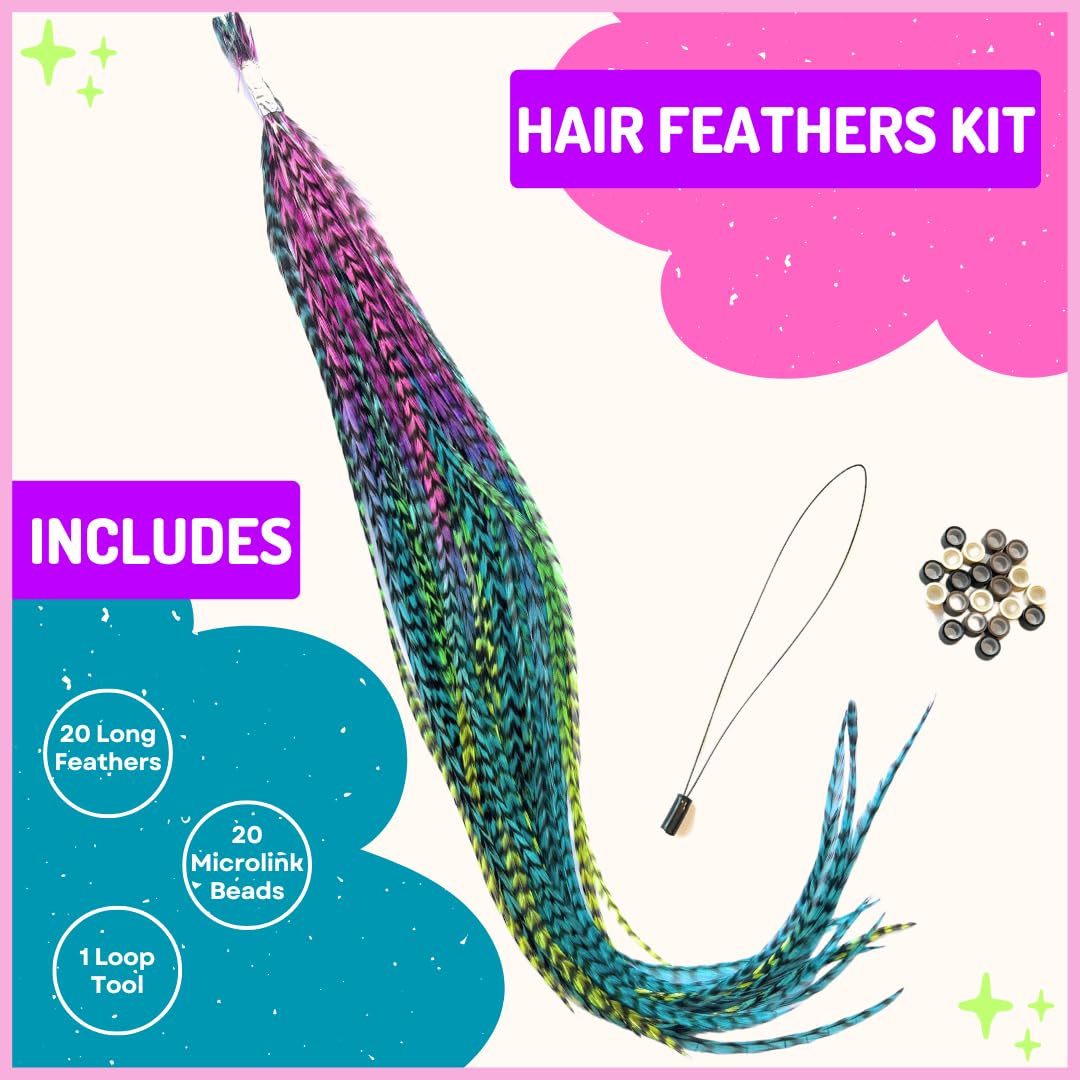 - Add a vibrant pop of color and boho-chic charm to your hair with these 20 Loose Feather Hair Extensions. Featuring a stunning mix of pink/blue and blue/neon green tie-dye hues, these feathers are perfect for anyone looking to make a bold, playful statement.