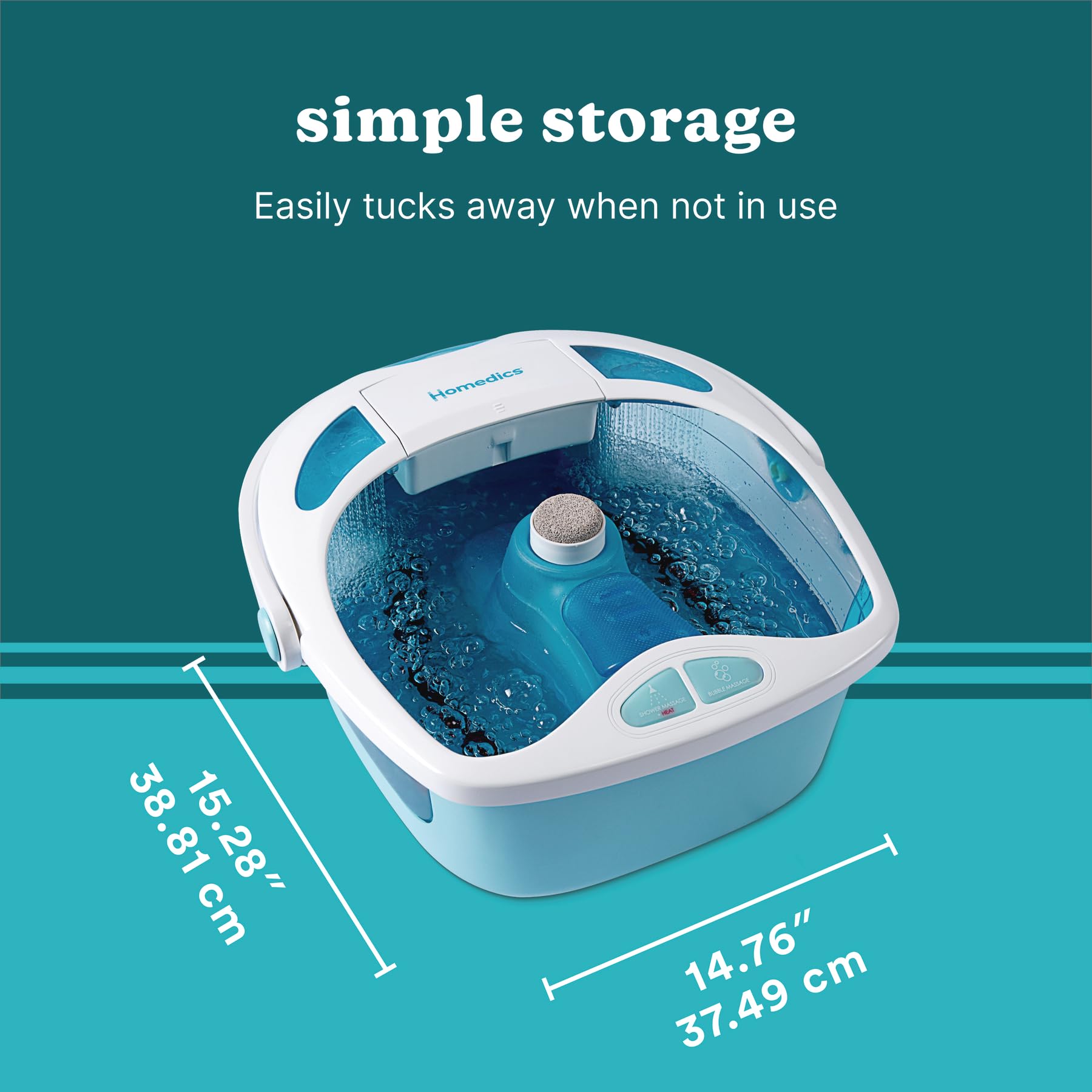 - PEDICURE CENTER: Three attachments are included with the footbath for the ultimate foot spa experience. The built-in pedicure center comes with a pumice stone, cleaning brush, and massage roller. They work to smooth and soften calloused feet. Easy tote handle for no-splash, no-mess carrying convenience